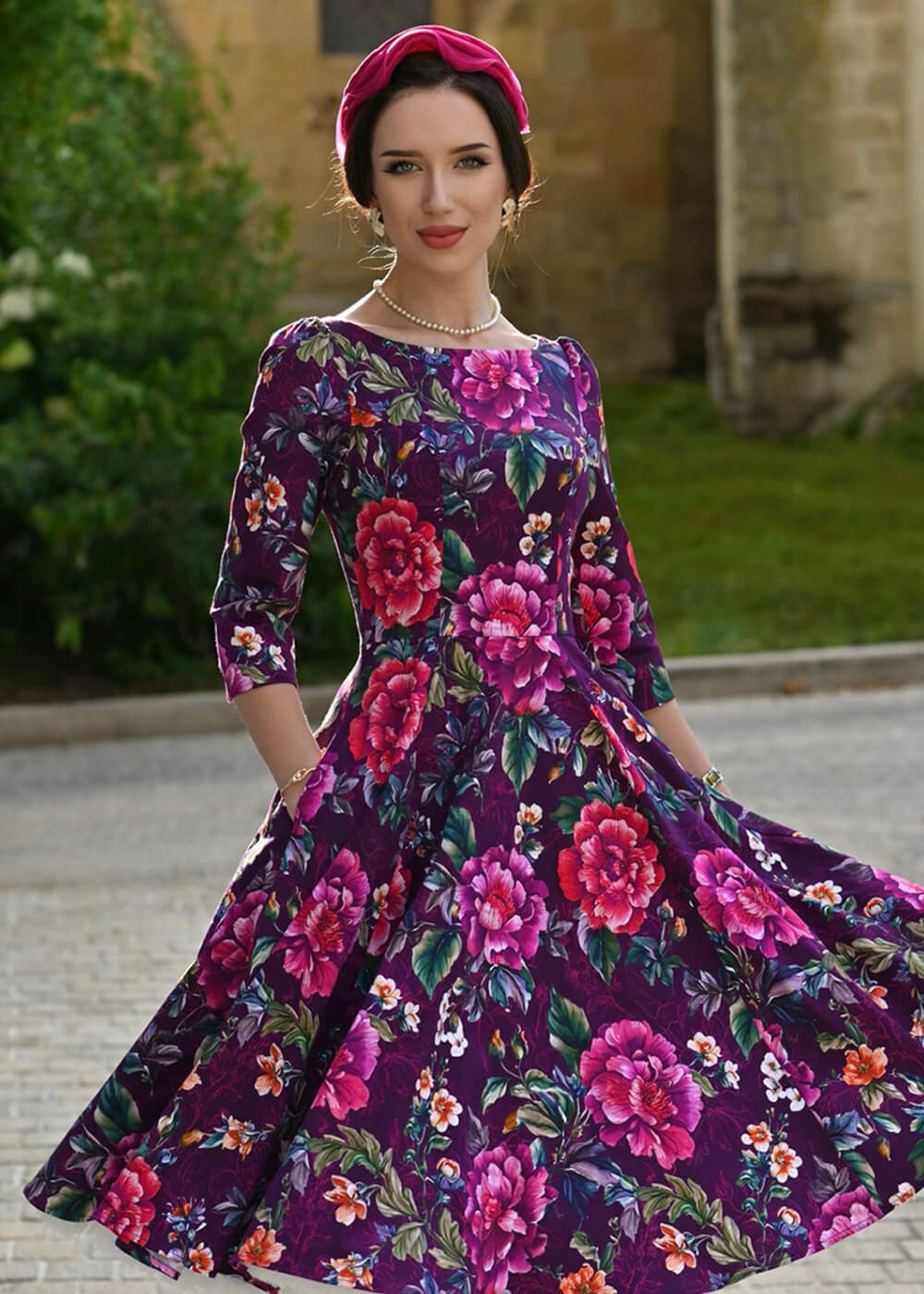 Hearts & Roses Robe Swing Florale Bea des Années 50 en Violet