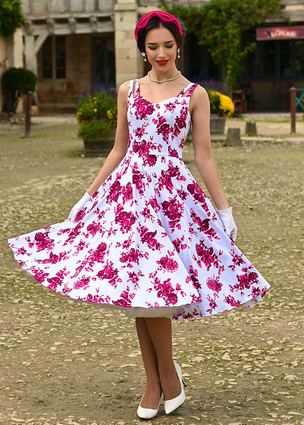 Hearts & Roses Rosaceae Robe Années 50 à Fleurs Blanche et Rose