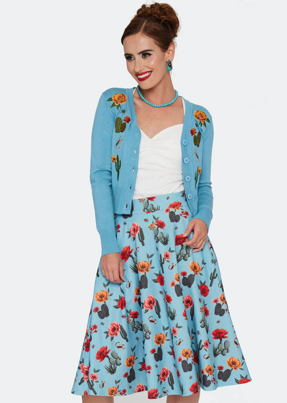 Voodoo Vixen Jupe Évasée 50’s Désert Floral Bleu