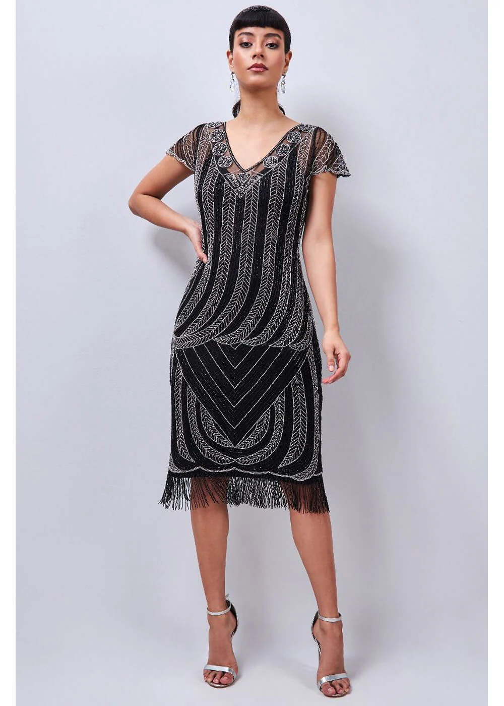 Gatsbylady Jade Fringe 20’s Robe Flapper Noir Argent
