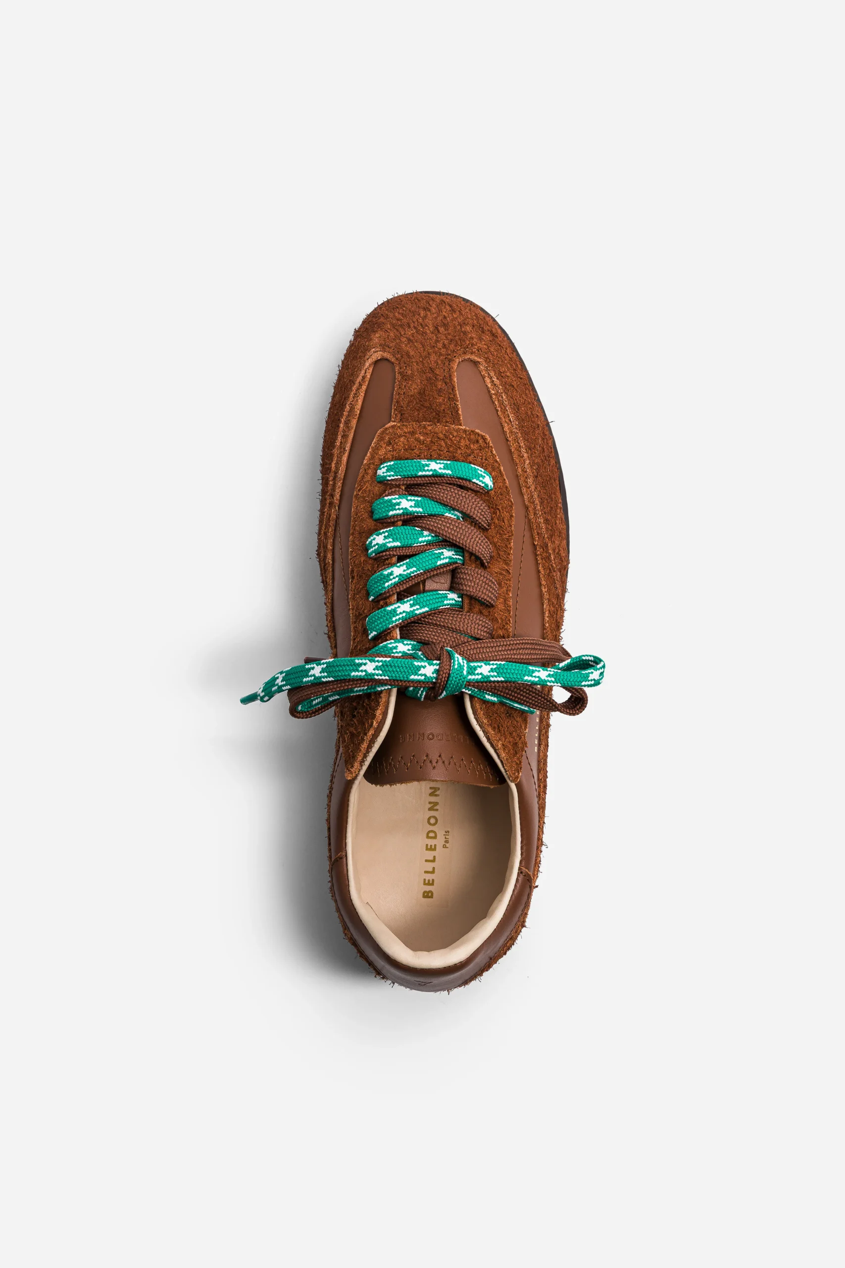 - Deux jeux de lacets sont inclus : un ton sur ton et un vert contrastant. Les deux sont installés sur la paire pour un jeu de matières et de couleurs, mais chacun peut choisir de porter l’un ou l’autre.