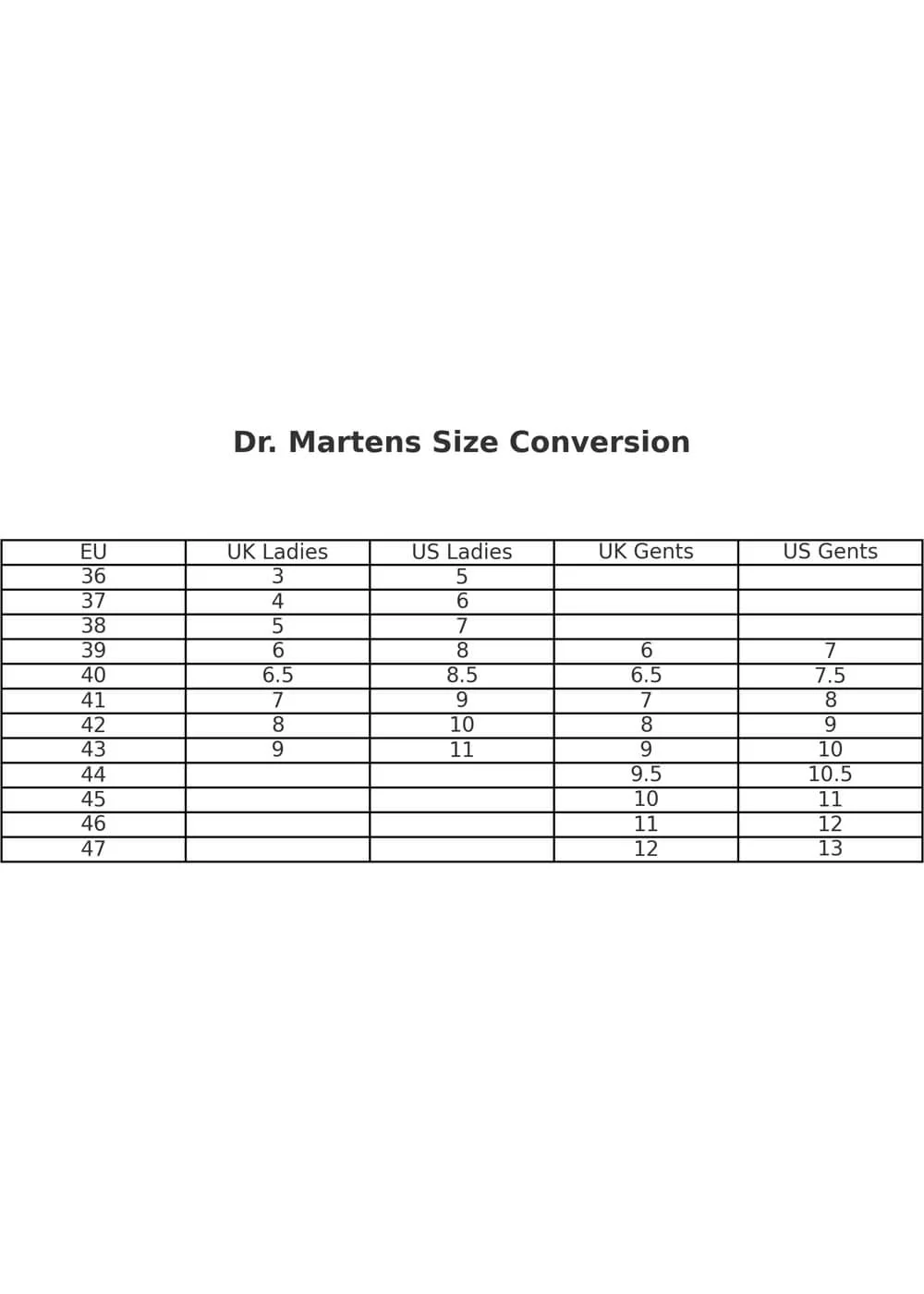 – Référez-vous au tableau des tailles dans la dernière image pour convertir correctement les tailles, nous vendons Dr. Martens selon les tailles de l’UE.