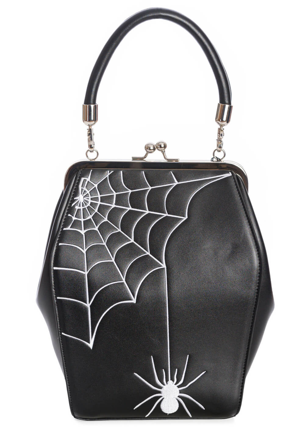 Perdez-vous dans ces terriblement belles toiles d’araignée brodées avec une araignée en simili cuir… Le sac en forme de cercueil se ferme avec un cadre en métal et un fermoir kiss-lock sur le dessus, et il est suffisamment spacieux pour votre téléphone, votre portefeuille et vos affaires essentielles. À l’arrière, il possède une poche inclinée et vous pouvez le tenir élégamment par la poignée.