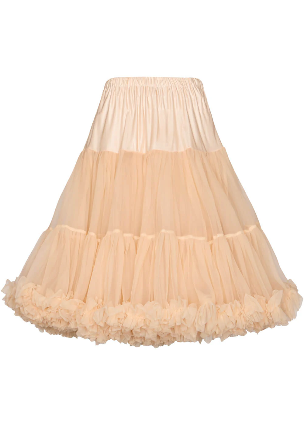 Deze bijzonder knuffelbare petticoats bestaan uit twee lagen zacht 2-baans chiffon die allebei een vrolijk gerimpeld randje hebben voor nóg meer volume. Daaronder zit een kortere onderrok, zodat ze niet aan je panty blijft plakken.