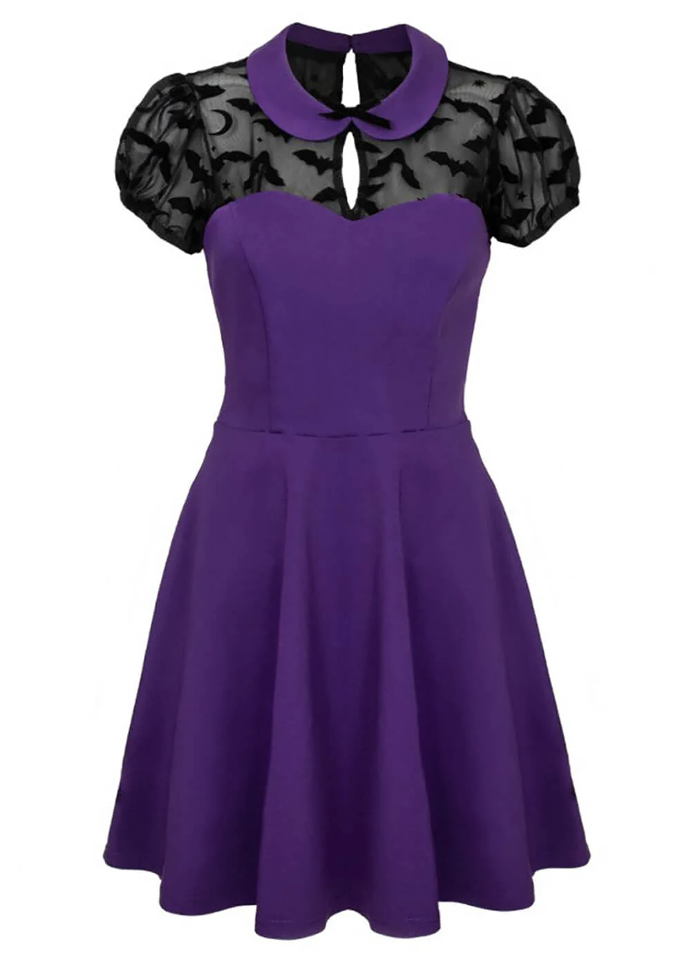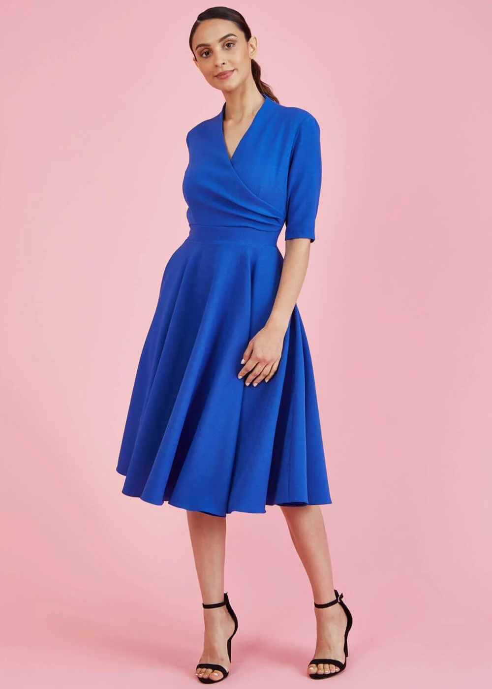 Vanaf de taille loopt de jurk uit in een volle rok, die je perfect kan dragen met een van onze petticoatsvoor die extra vrolijke zwier. Ze sluit met een rits aan de zijkant en komt bij een lengte van 1.70 over de knie.