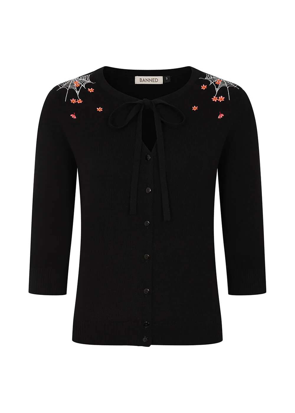 Mia est le cardigan rétro par excellence, avec son détail trou de serrure et son petit nœud charmant, et en prime une touche Ghoulish avec ses broderies de toiles d’araignée ! Que ce soit en vedette sur une jupe ou une robe, pour la reine du cri vintage ou la girlboss moderne d’Halloween, Mia vous accompagne chaque jour ♥