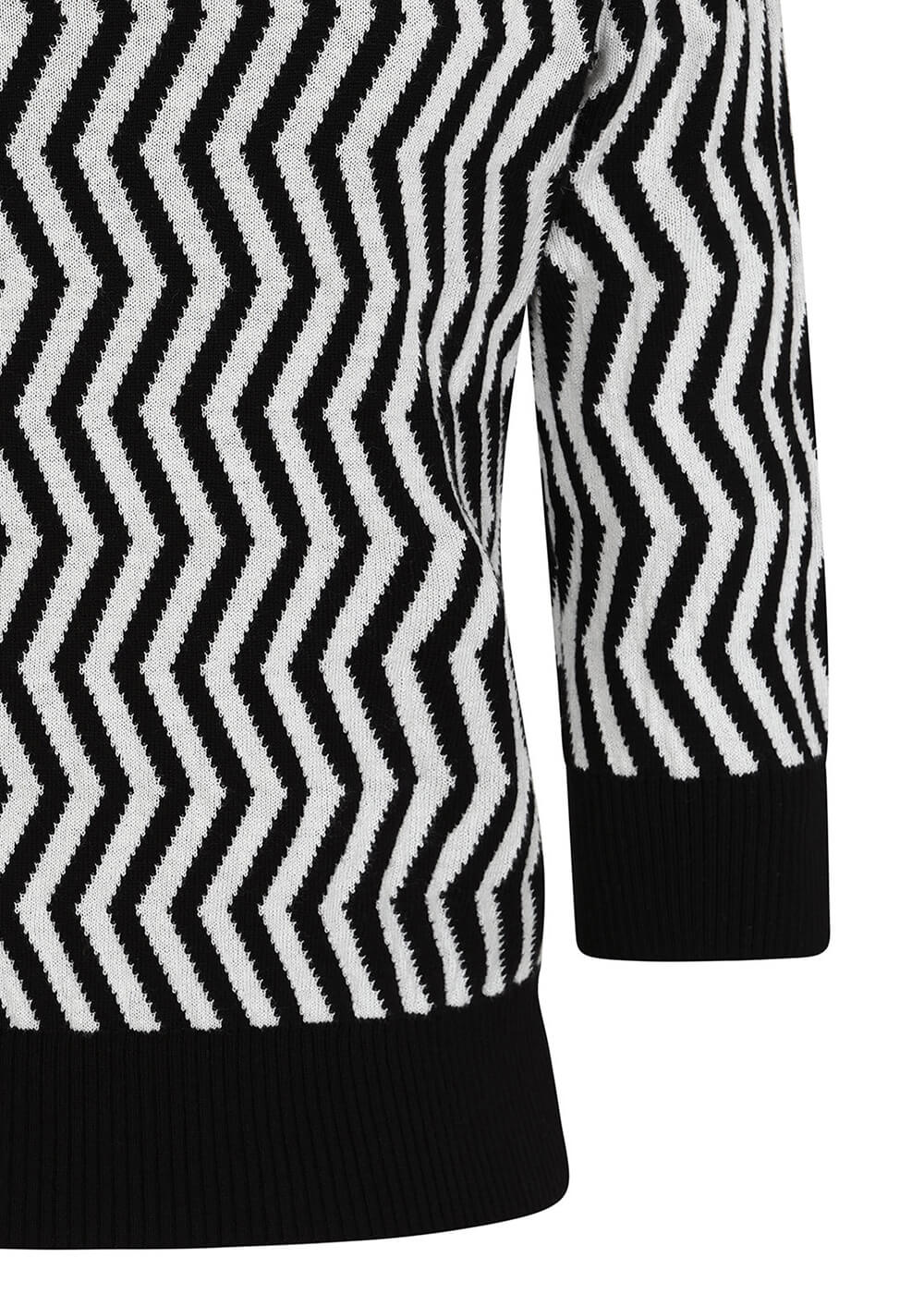 Laissez-vous hypnotiser par ce joyeux motif zigzag ! Avec sa coupe confortable et son doux tricot en coton extensible, vous ne voudrez plus l’enlever, n’est-ce pas ? Les bords noirs contrastants associés aux manches ¾ ludiques donnent à cette beauté un caractère qui lui est propre et qui s’accorde parfaitement avec le vôtre : une véritable combinaison de rêve ♥