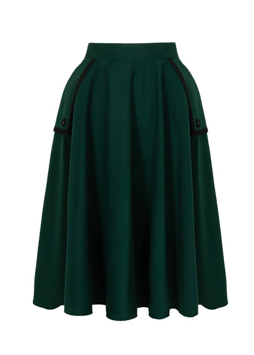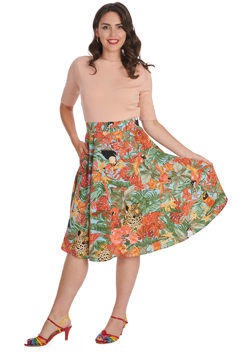 Dit taille-modelletje retro-rok mét zakken is gemaakt van een soepele stof zonder stretch, dat vanaf de taille zwierig uitloopt en bij een lengte van 1.70m ongeveer op de knie komt. Ze sluit met een rits aan de achterkant.
