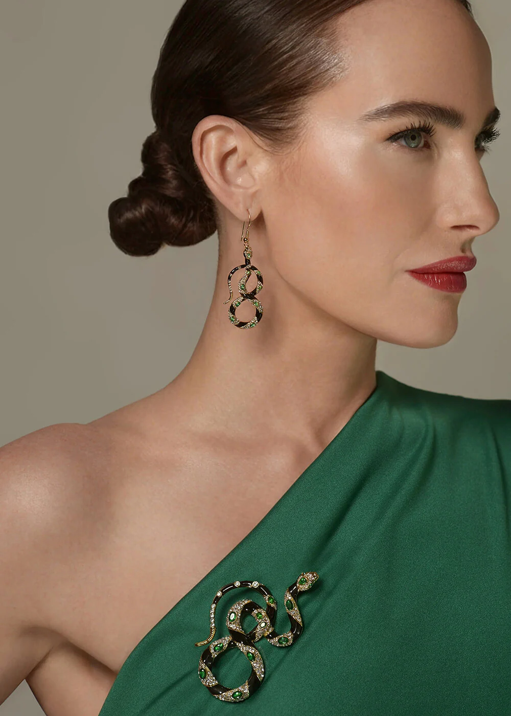 La broche serpent sertie se love élégamment sur votre blazer, robe ou col et capte la lumière à chaque mouvement. La finition dorée 14 ct, l’émail noir peint à la main et les cristaux vert émeraude lui confèrent un véritable look « héritage ». Sssspectaculaire, non ?