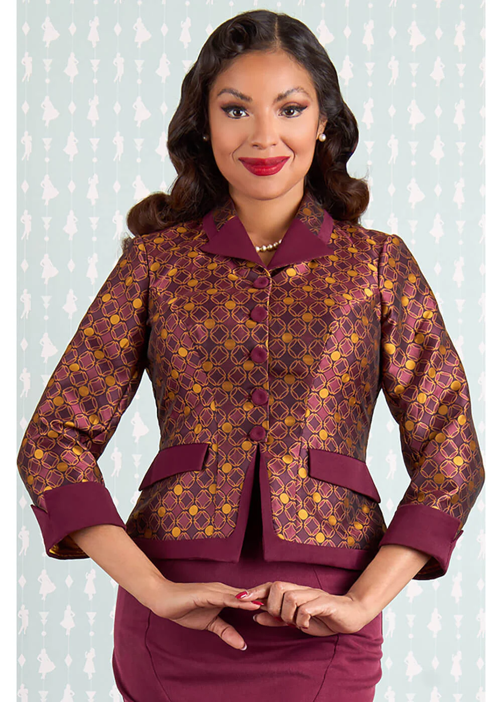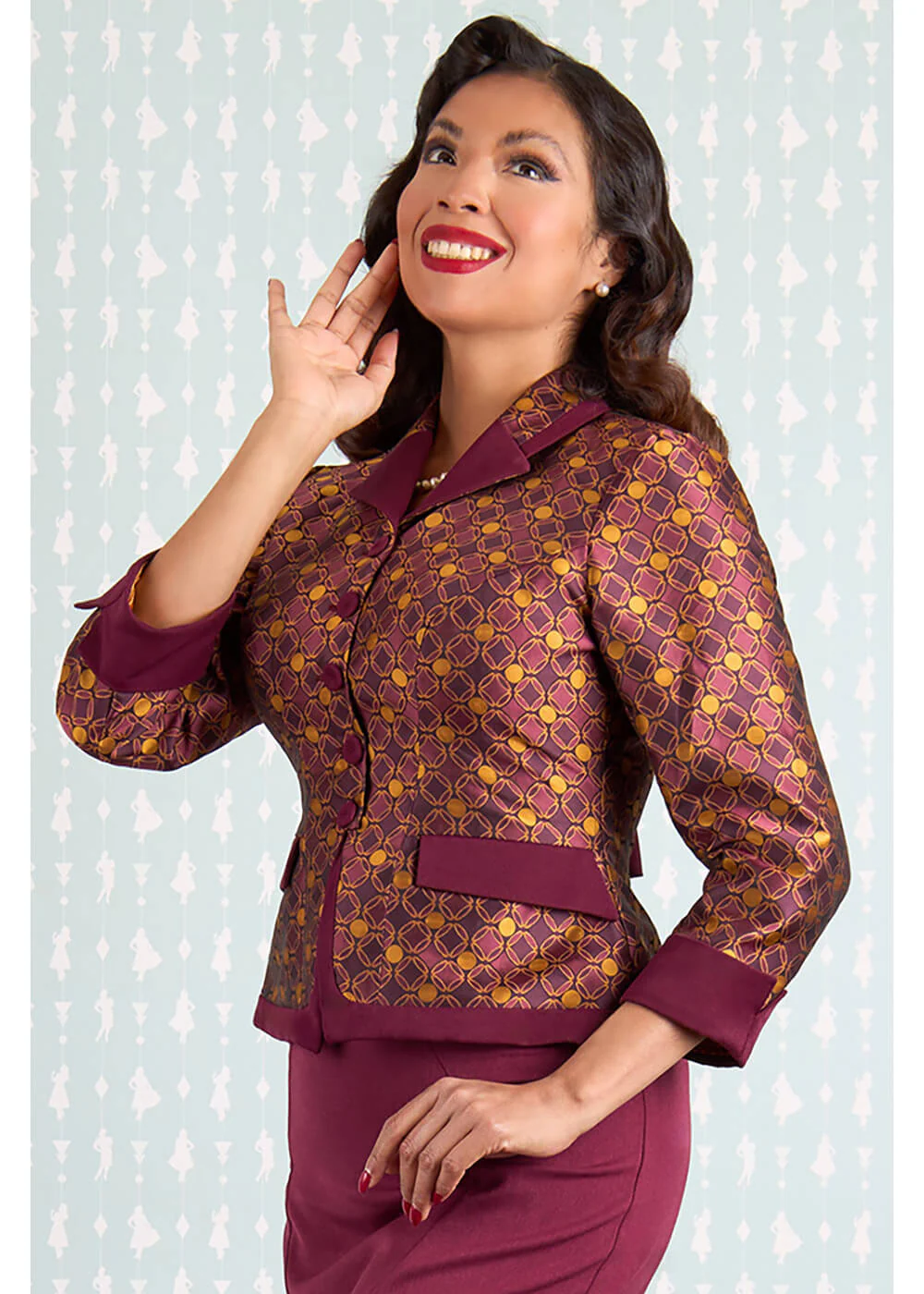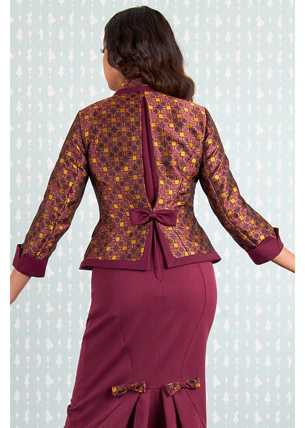 Rien n’est aussi vintage-chic qu’une veste inspirée de l’art déco avec des motifs géométriques, qui brille littéralement grâce à son mélange d’or et de vin. Même en vous éloignant, vous ferez impression avec l’insertion vin rouge ornée d’un nœud ! Une telle beauté, comment la laisser passer ?