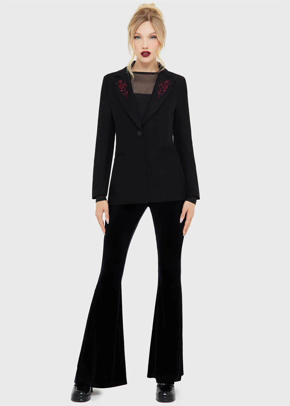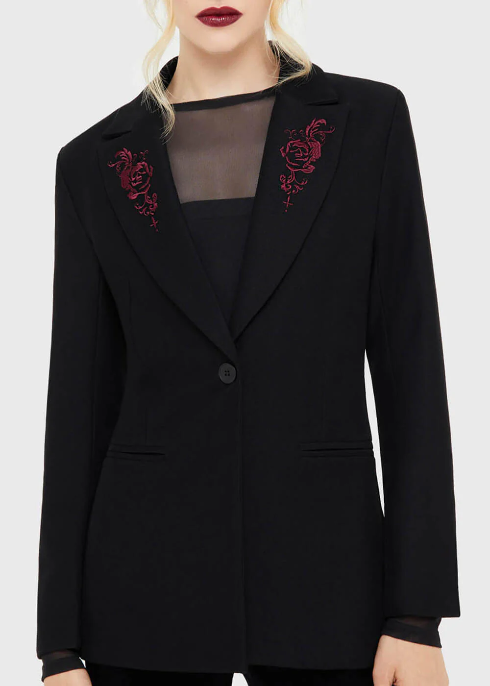 Découvrez l’élégance ténébreuse avec ce blazer noir conçu par Killstar. Sa coupe raffinée s’accompagne de détails mystiques, faisant de lui la pièce idéale pour affirmer votre allure gothique au quotidien.