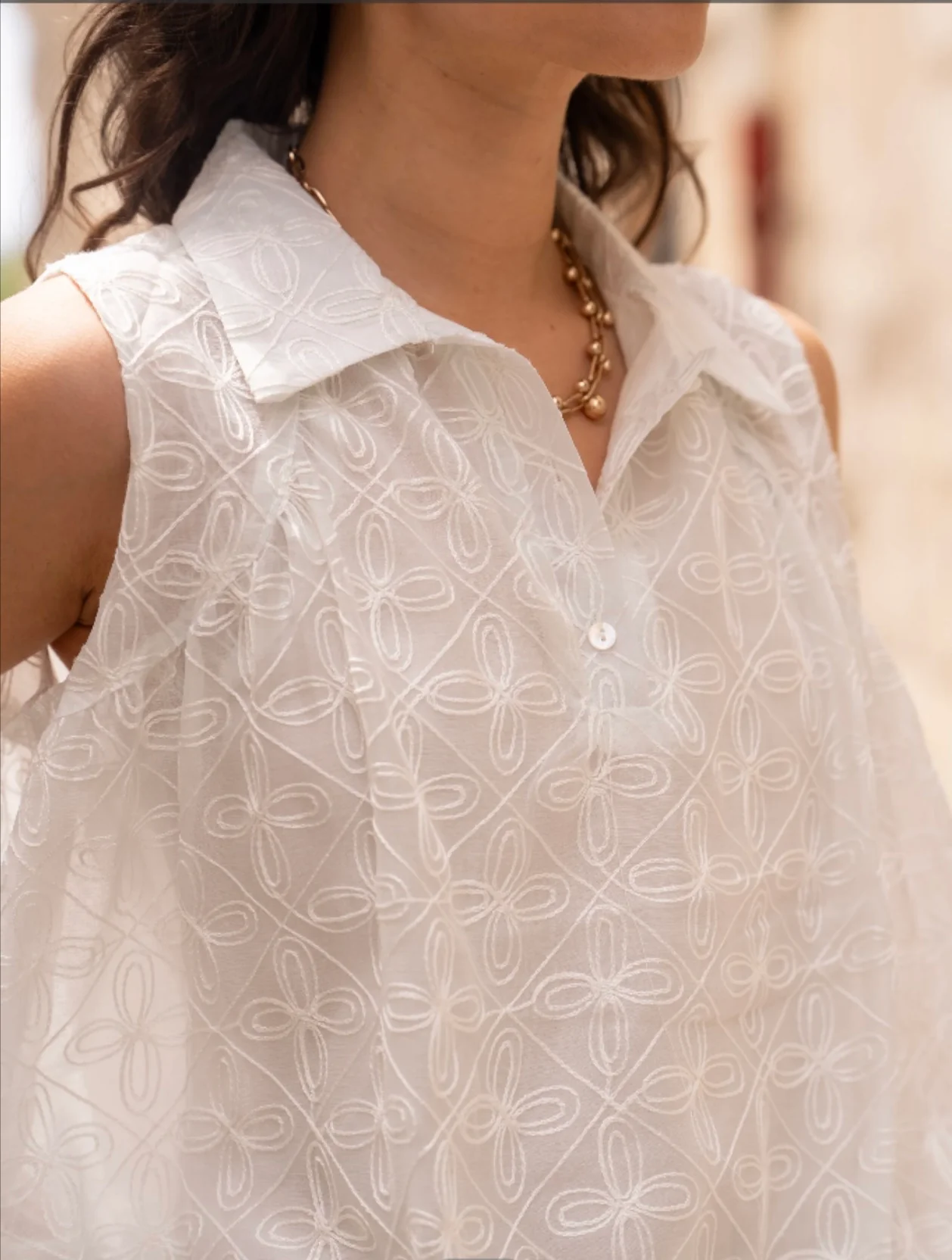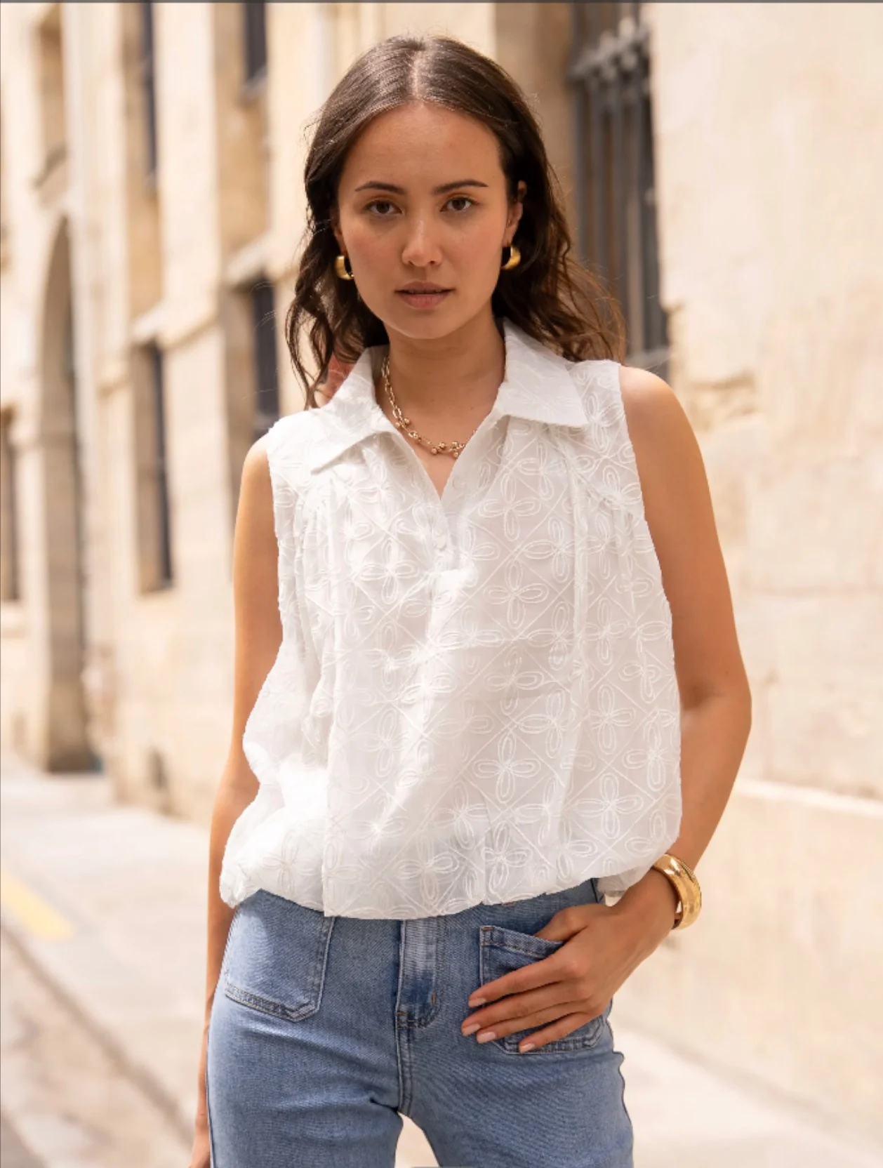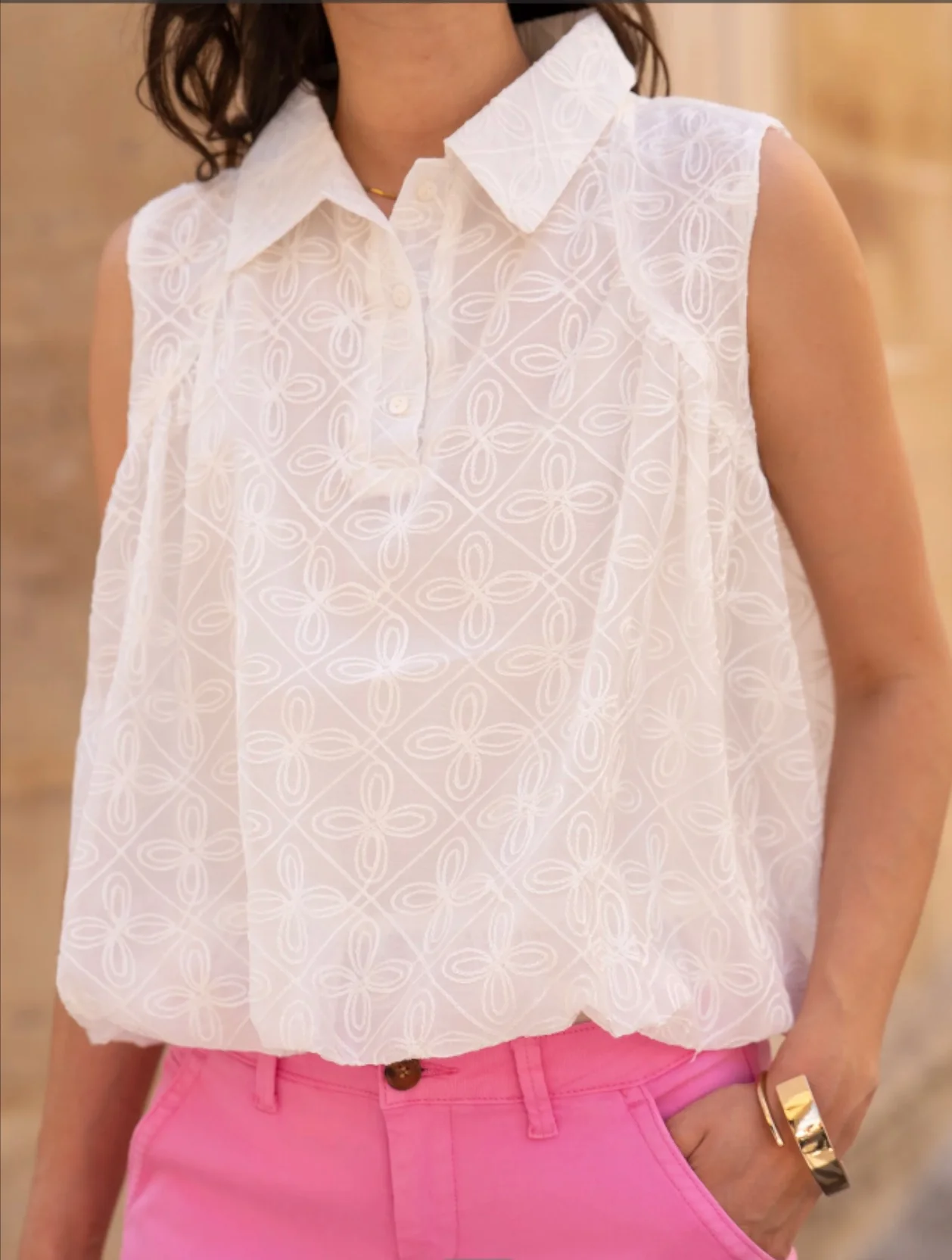 Craquez pour cette blouse sans manches à la coupe légèrement évasée, confectionnée dans une broderie anglaise délicate. Son col chemise et sa patte de boutonnage apportent une touche chic et structurée. Le bas légèrement blousant permet un porté fluide et féminin.