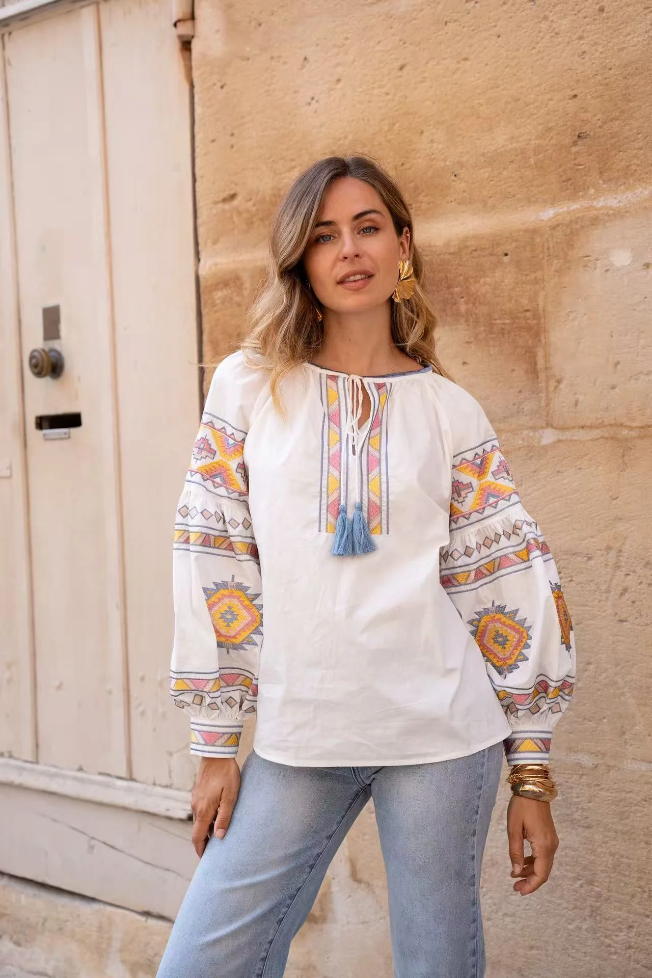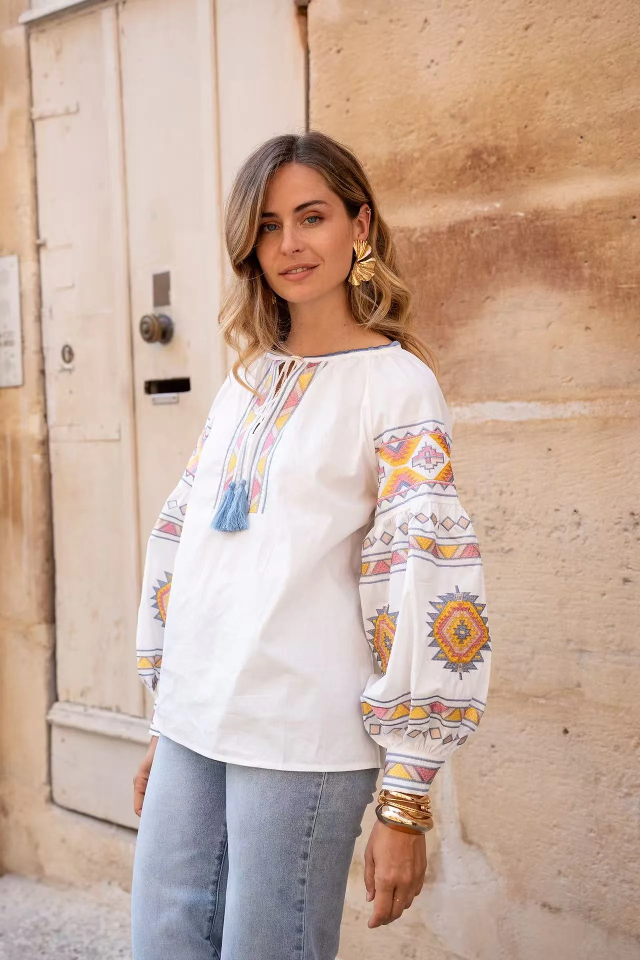 Blouse brodée esprit bohème chic, parfaite pour une touche de couleur et d’originalité dans votre dressing.