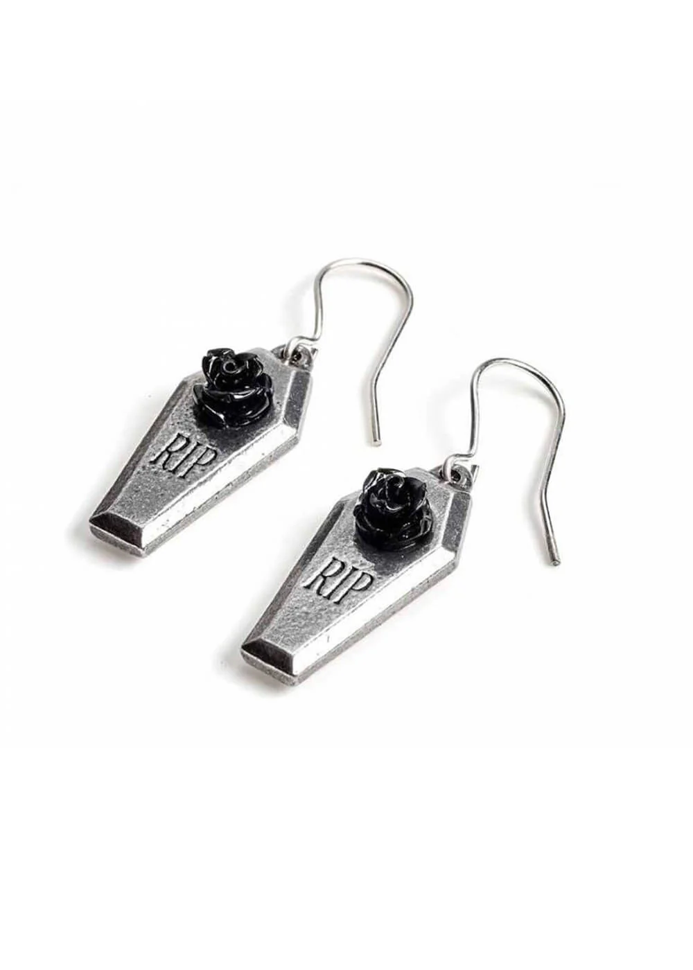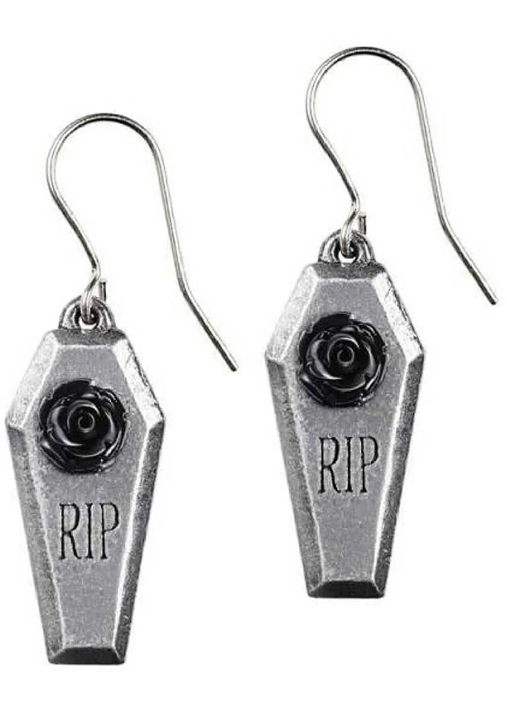Des boucles d’oreilles comme celles-ci vous accompagneront jusqu’à votre dernière demeure, tant elles sont belles ! Elles possèdent un éclat vintage magnifique et prennent la forme de petites cercueils. De plus, deux petites roses en résine noire ornent l’avant. Les vêtements sont importants, mais les bijoux complètent la tenue !