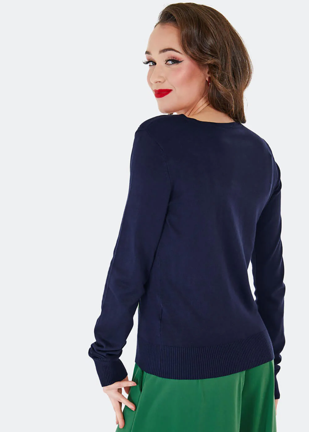 N’est-elle pas délicieusement irrésistible, cette ravissante veste ? Elle l’est pour vous ! Son tricot doux de couleur marine est l’écrin parfait pour les broderies uniques de dionées qui la recouvrent. Grâce aux boutons, elle s’ôte et s’enfile aisément, et elle vous garde bien au chaud même à l’automne. Ne laissez pas passer cette occasion !