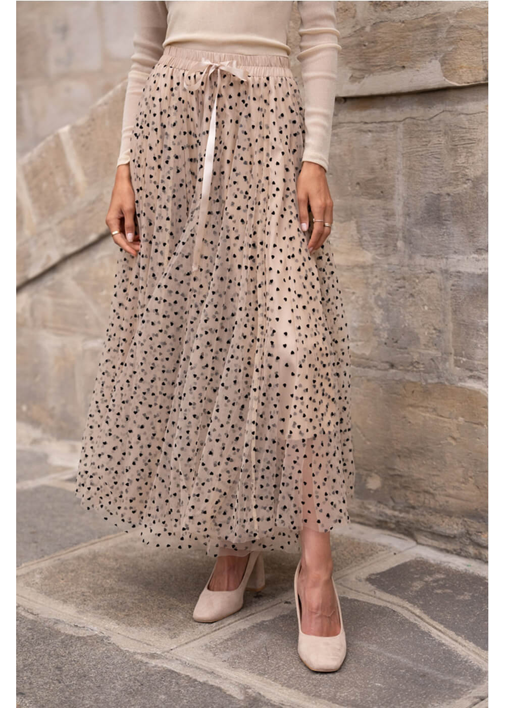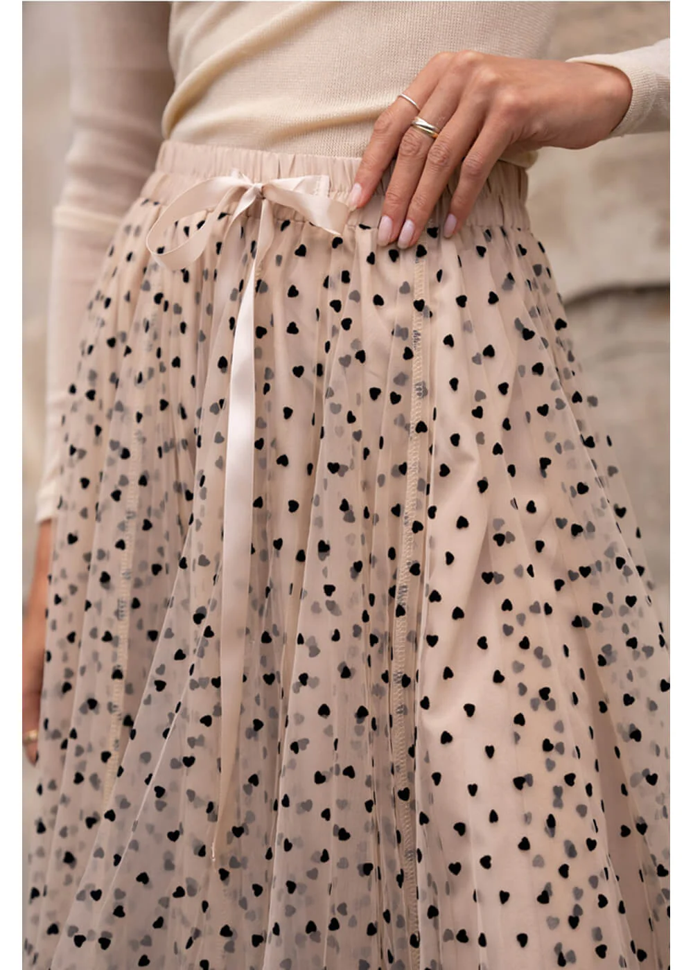 Avec sa quantité infinie de tulle, ornée de cœurs ludiques, elle danse à chaque pas avec vous et possède un volume absolument magnifique. La jupe intérieure arrive juste au-dessus du genou, mettant encore plus en valeur le tulle semi-transparent.