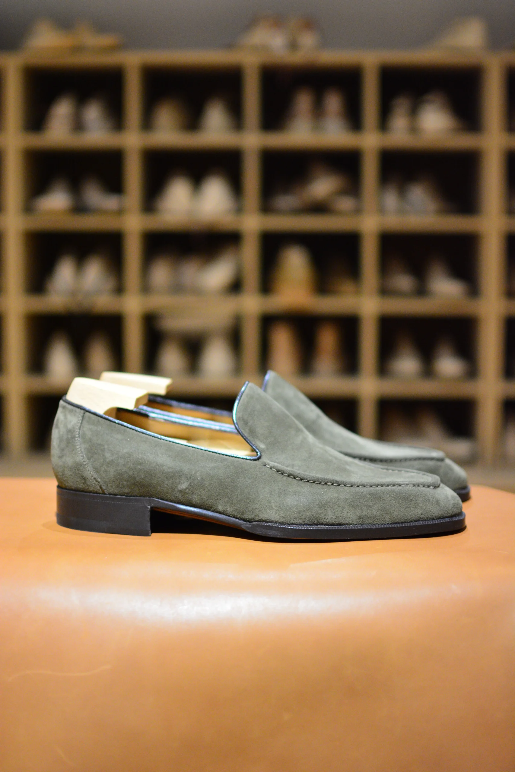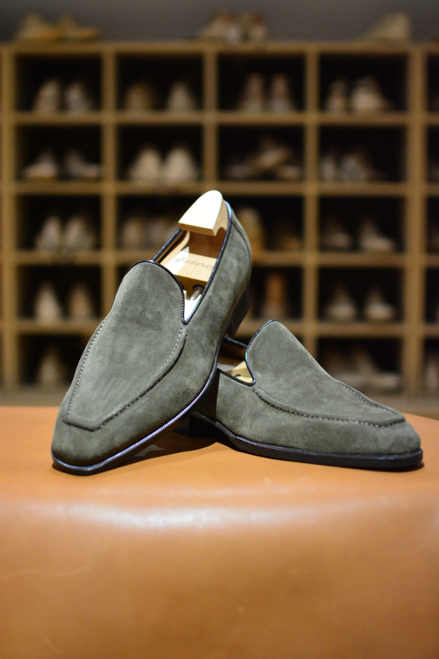 Le Dario fut au départ une création totalement personnalisée. Un loafer sans pompons, sans patte, mais simplement avec une couture à la main aux proportions revisitées sur le plateau. Un fin passepoil tout autour de la tige permet d’imaginer les accords les plus délicats. Le Dario, un surprenant mocassin.