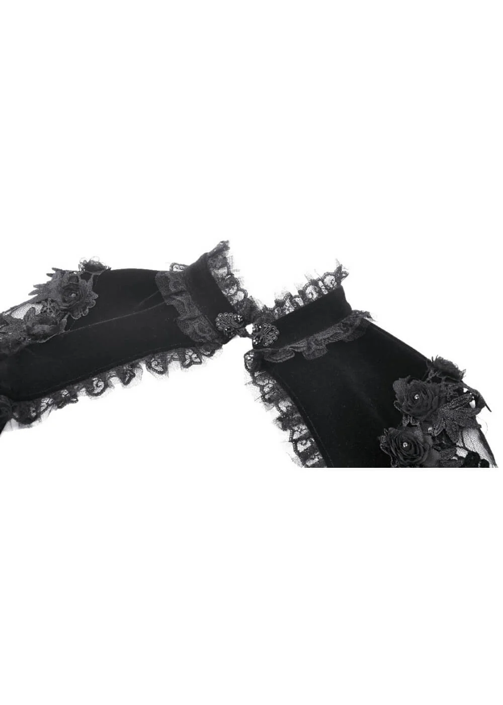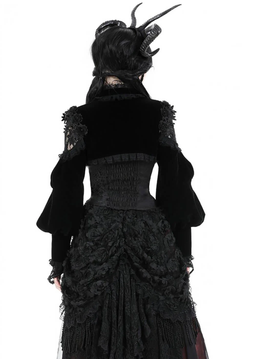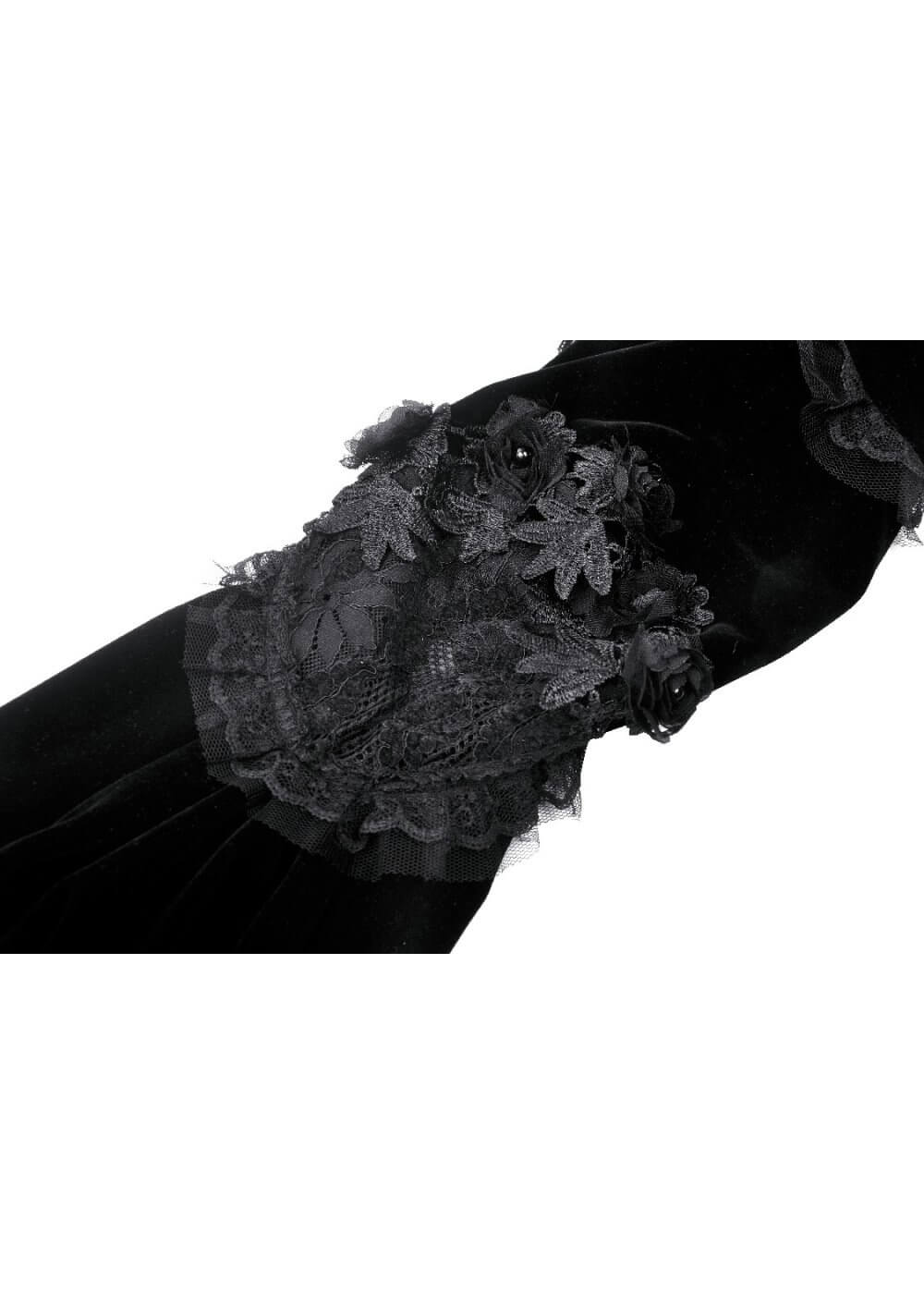 Gitzwart fluweel, sensueel kant en elegante appliques – met de Escape Shrug zal niemand aan de betovering van jouw look ontsnappen! Haar poffende lange mouwen met vingerlusjes geven een klassieke Gothic-look om na te kijken en is net zo geweldig tijdens de feestdagen. Onweerstaanbaar mooi…