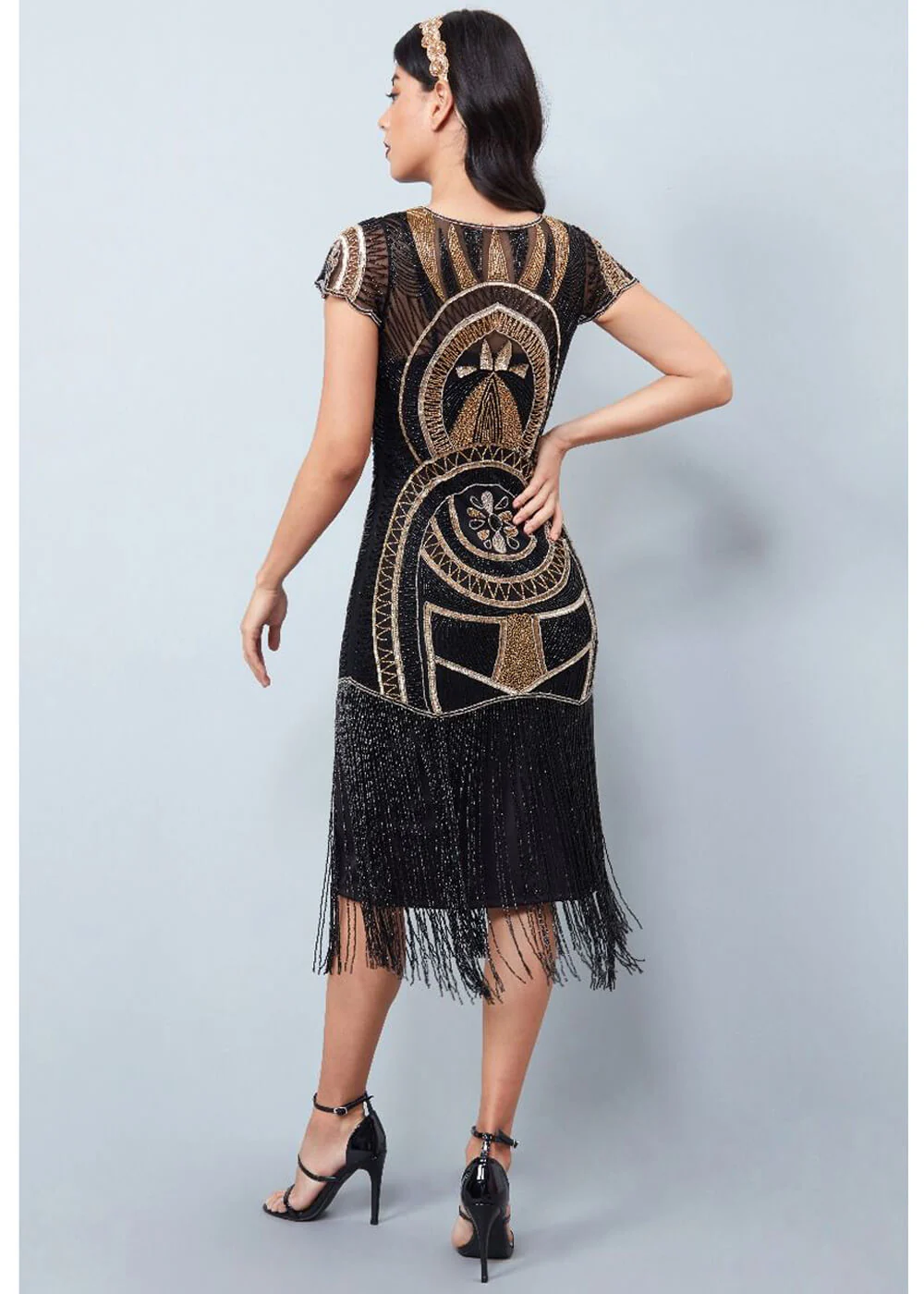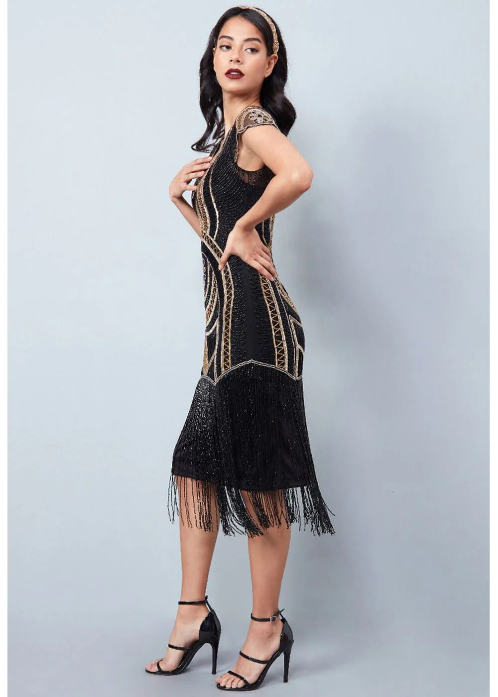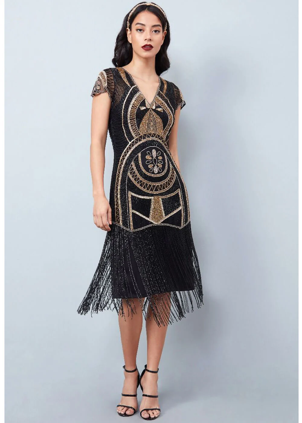 Mary est art déco avec ses lignes spectaculaires, créées par des perles et des sequins cousus à la main ! Une robe flapper n’est pas complète sans les franges qui dansent, il faut danser !