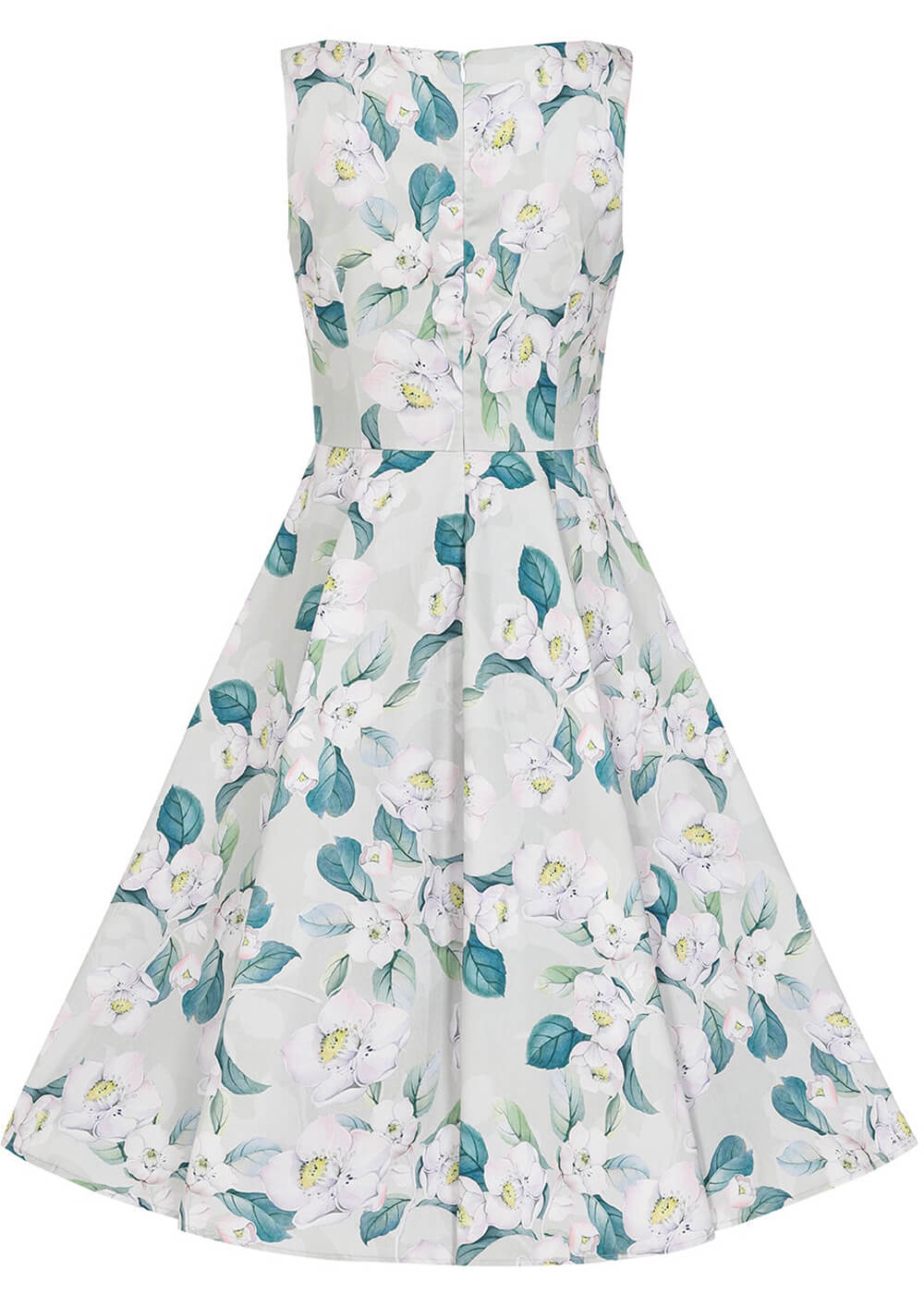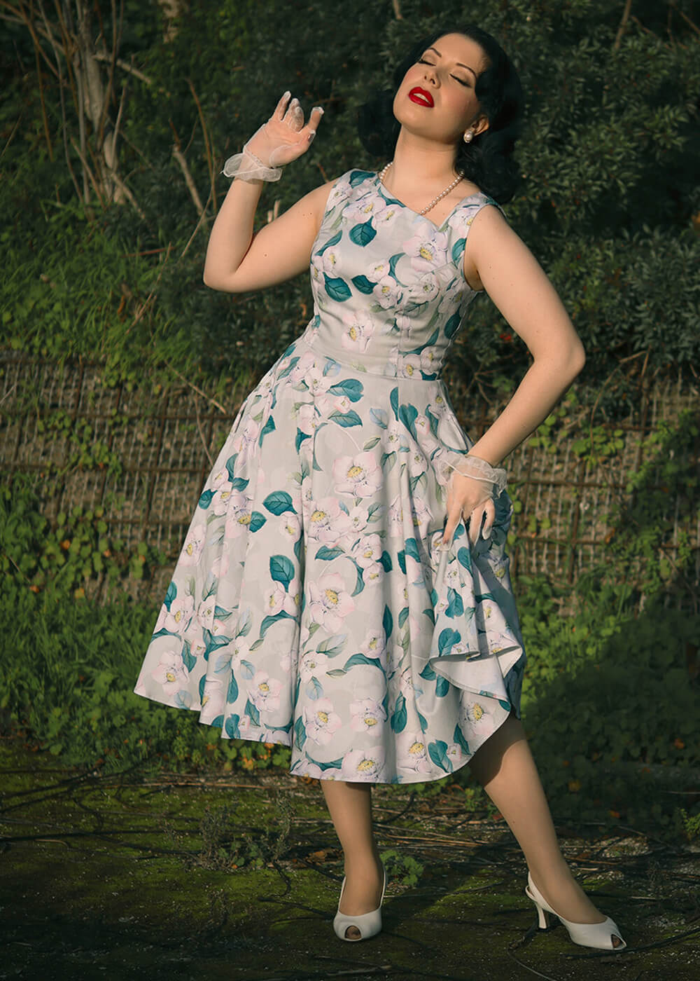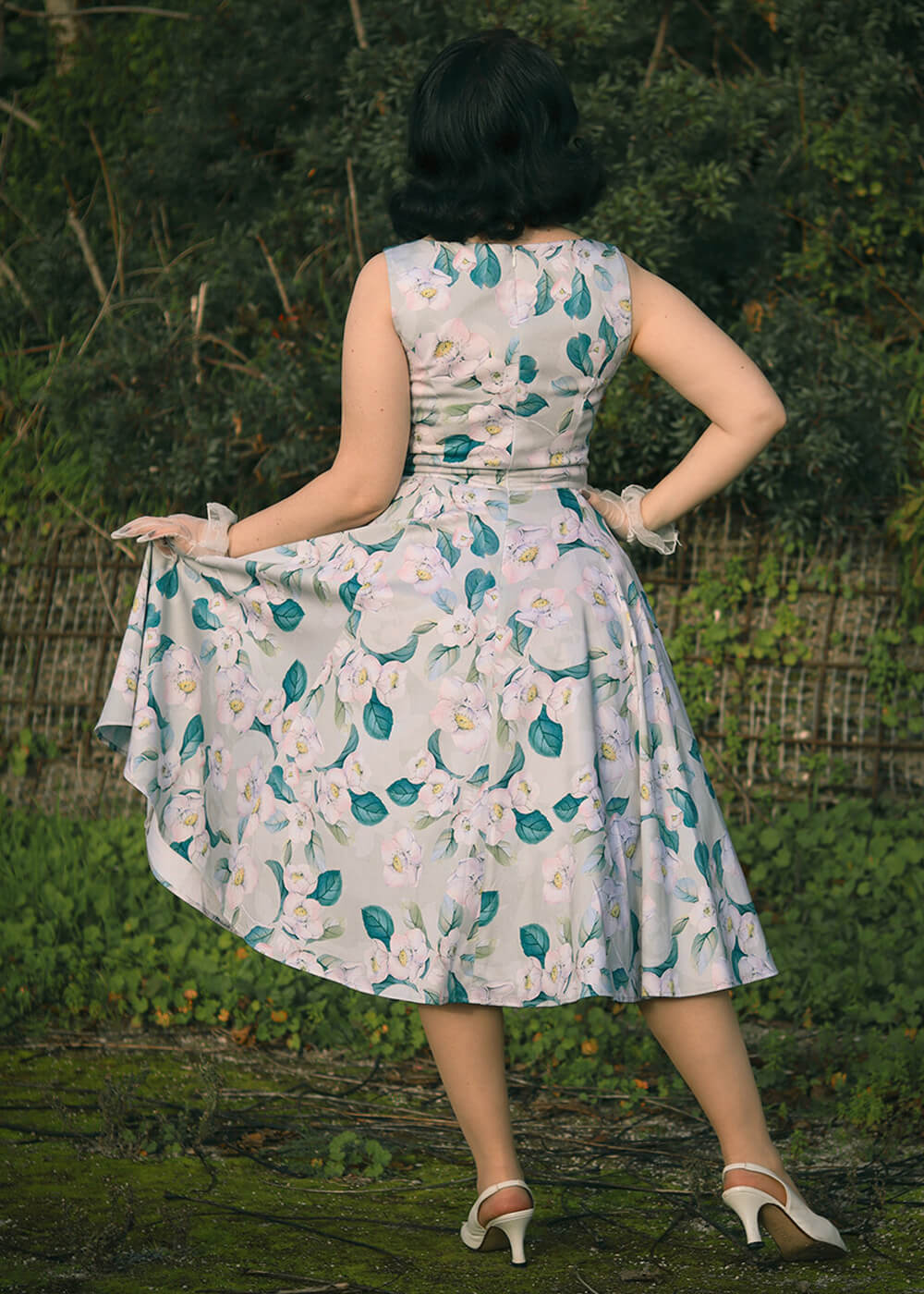 Depuis des années, Hearts & Roses crée la robe swing classique des années 50 parfaite pour tous ceux qui aiment la mode inspirée vintage. Rey en est un exemple ; elle possède un magnifique décolleté asymétrique, un superbe imprimé floral et une douce couleur gris clair qui convient à tout le monde. Laissez-vous aller au balancement !