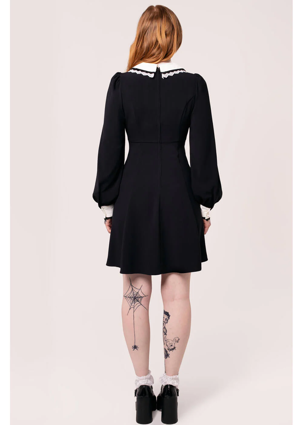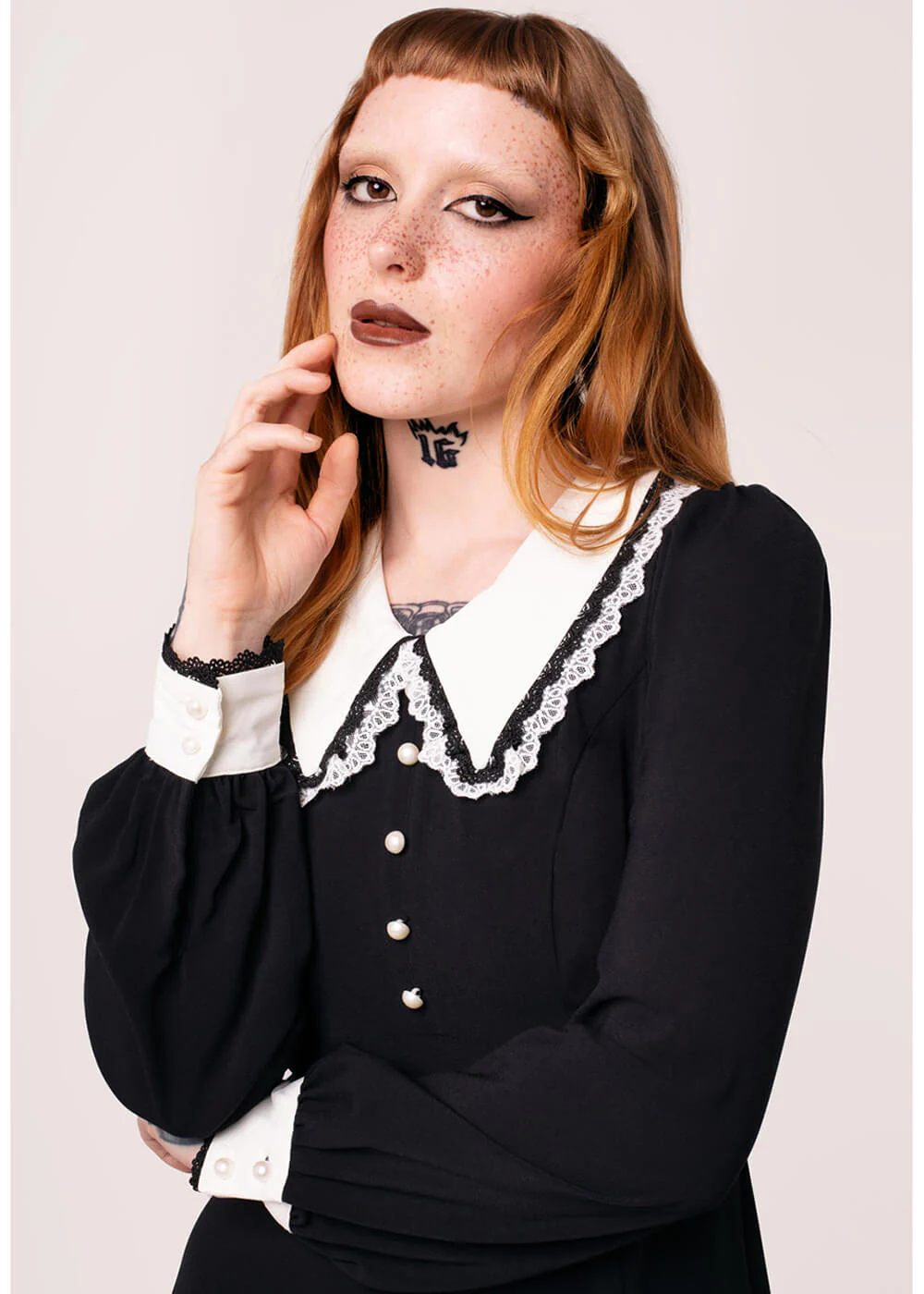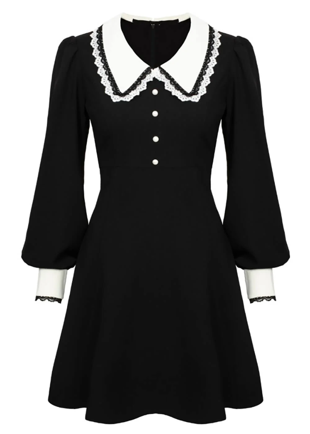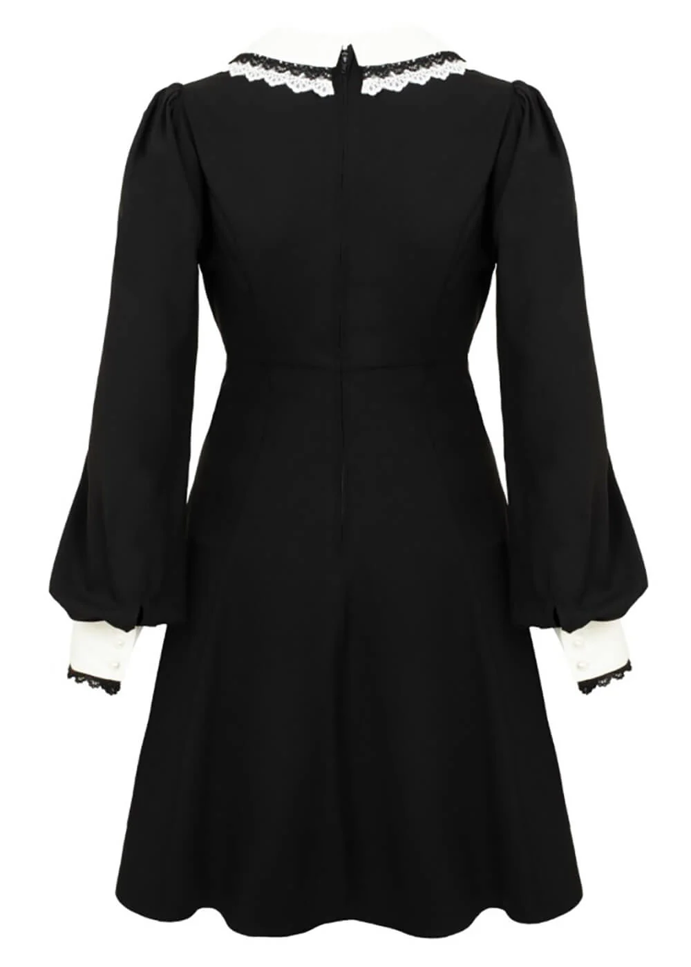 Le mercredi est-il ton jour préféré ? Récupères-tu des réactions allergiques spontanées aux couleurs ? Alors cette robe crie ton nom. Ses manches évêque avec des poignets contrastants et son élégant col lui donnent le look parfait de mercredi que tu désires tant. Elle est facile à enfiler et à enlever grâce à sa fermeture éclair, et as-tu remarqué les subtils bords en dentelle ?