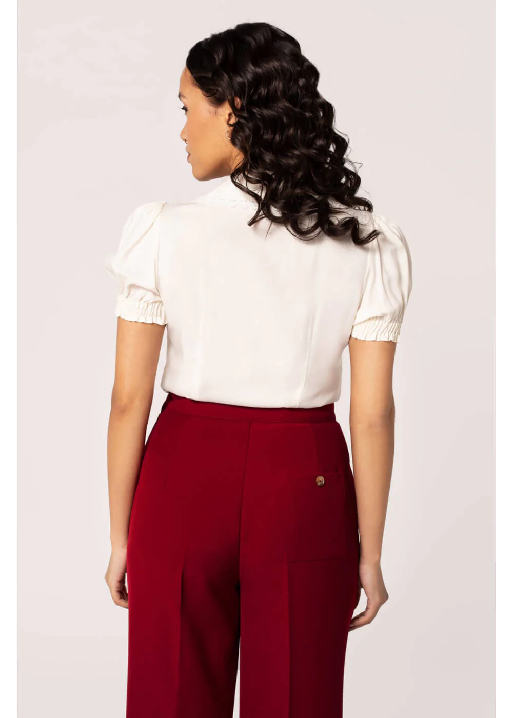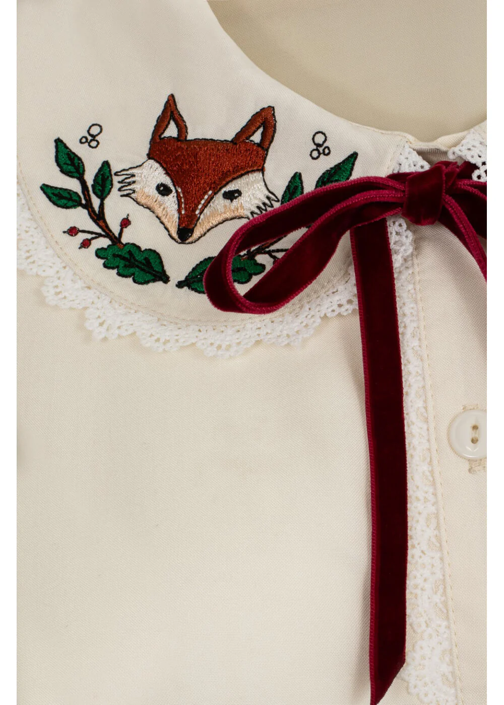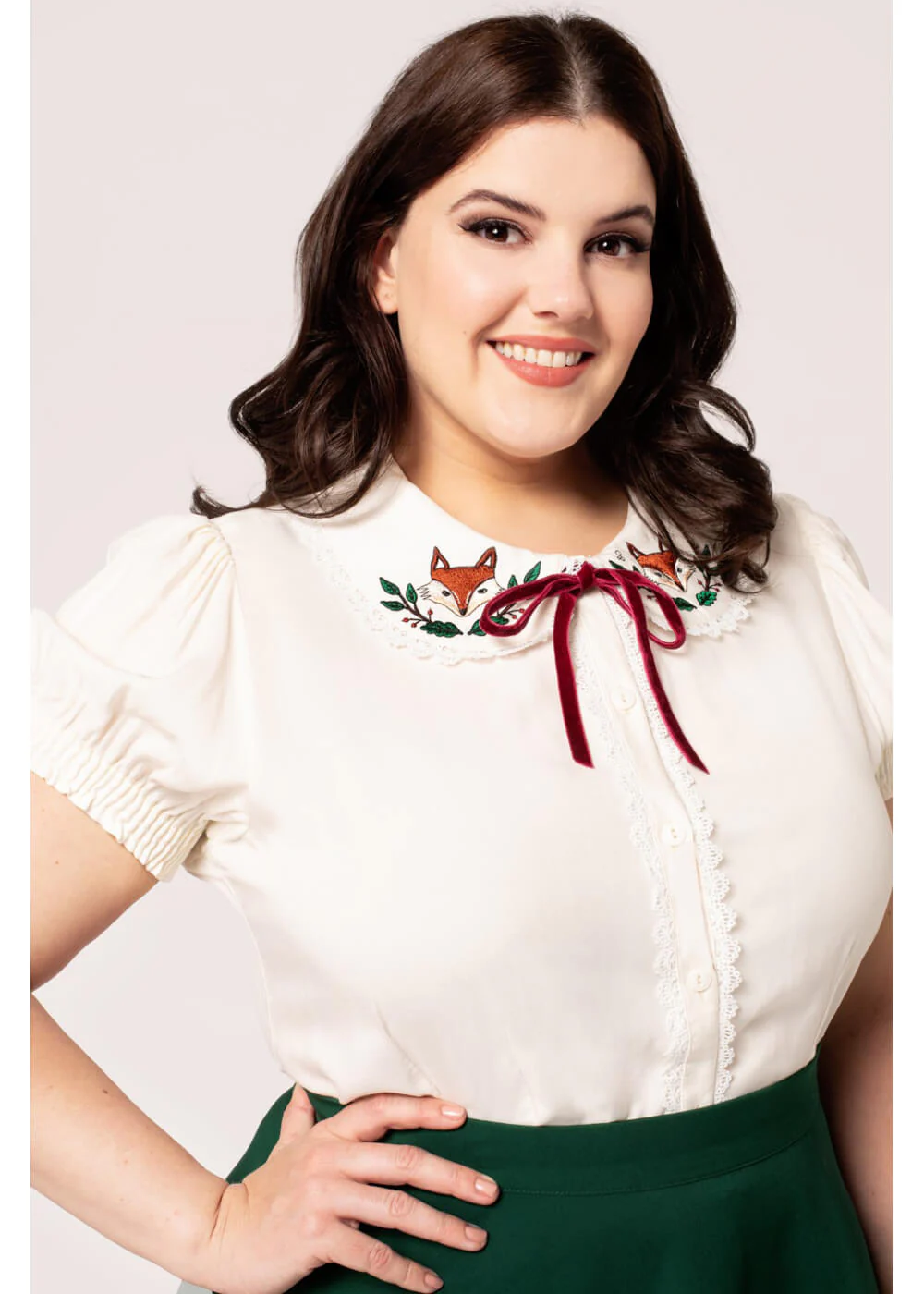 Avec leur regard curieux, ces petites broderies de renards sur le col vous interpellent ! Cette blouse élégante respire les années 1940 avec ses manches bouffantes courtes et ses bordures en dentelle autour du col Peter Pan et sur la rangée de boutons à l’avant. Que vous portiez Basil avec un pantalon ou une jupe taille haute, le regard des renards et des humains sera assuré !