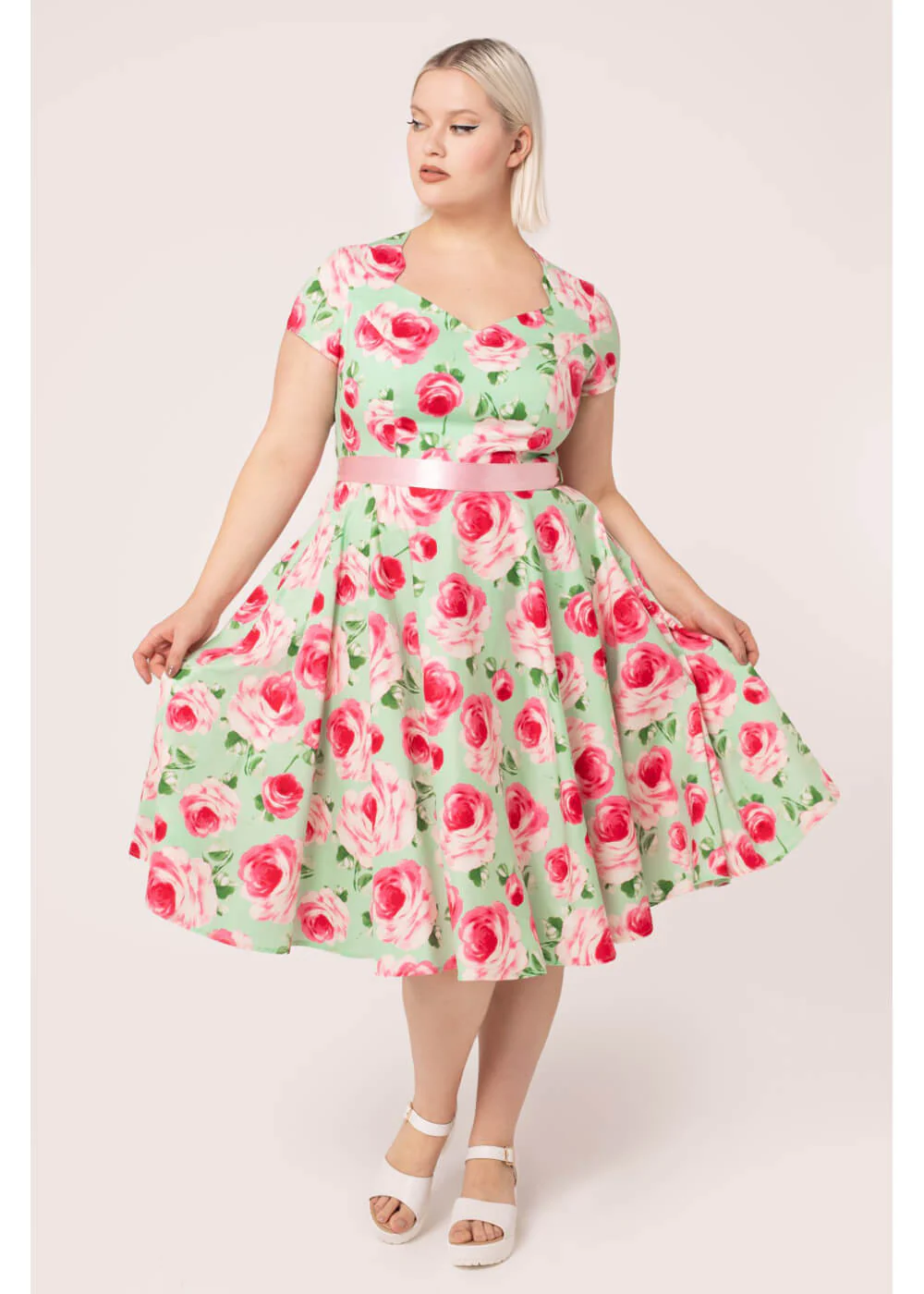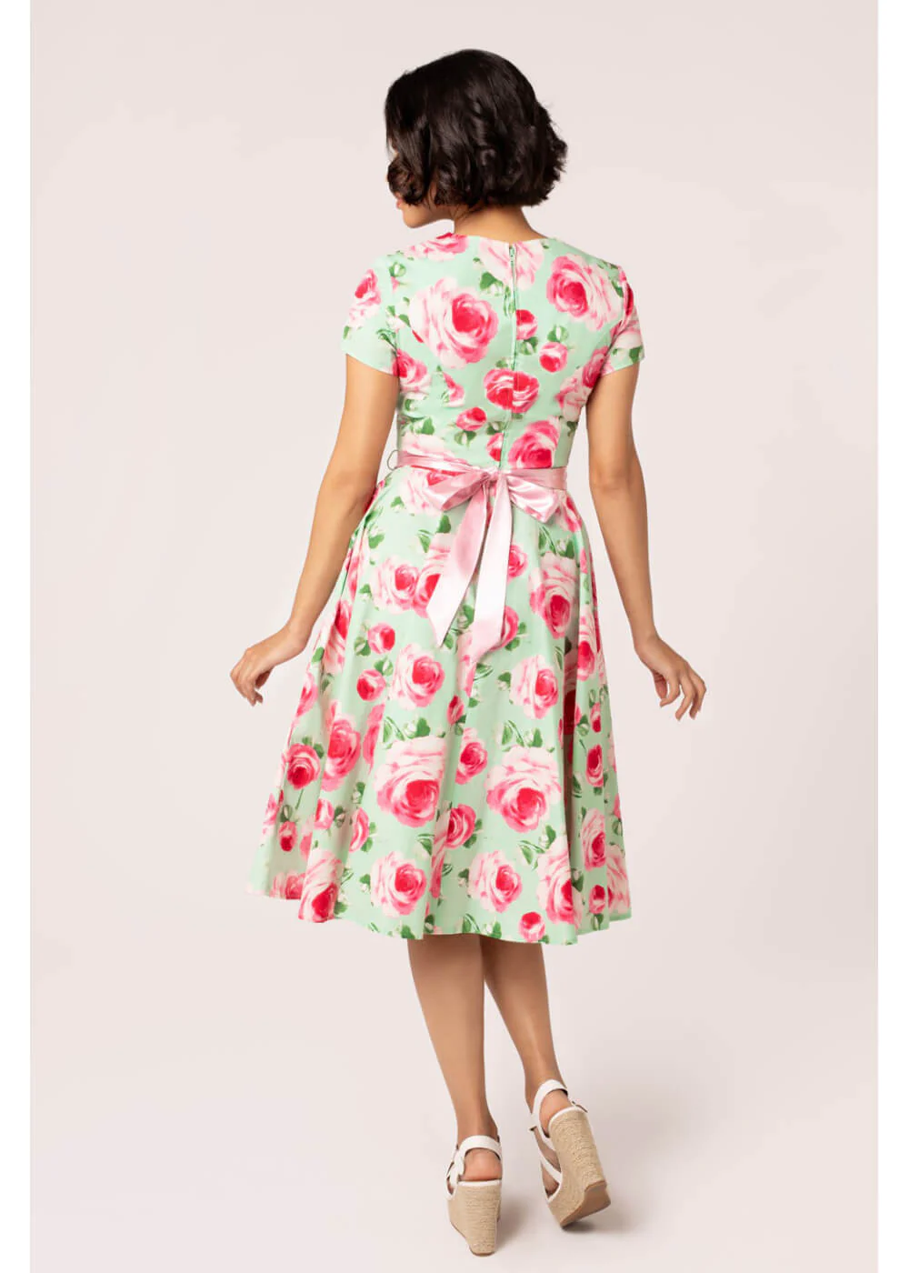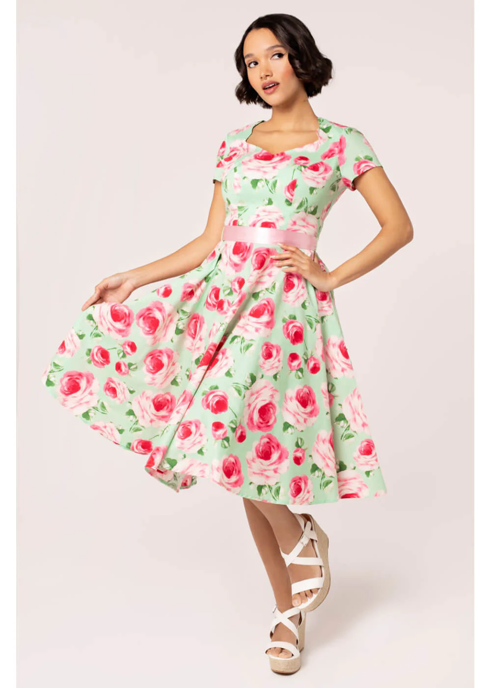 Met zo’n adembenemende swingjurk als Camille wordt elke dag gelijk een mooie dag! Die speciale dag, een gezellig uitje of gewoon naar het werk? Met haar zachte rozenprint op mintgroene katoen-mix ben jij een fleurig boeket en met zo’n elegante geschulpte halslijn en speels geknoopte satijnen sjerp had je zo uit je favoriete jaren 50 film kunnen stappen. Stijl vergaat niet, net als dit boeket!