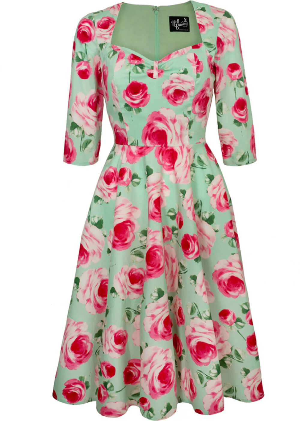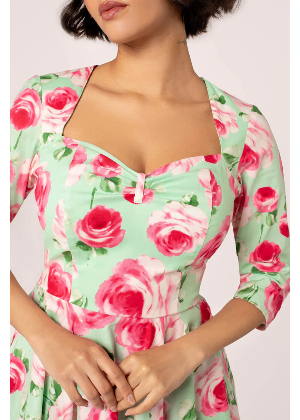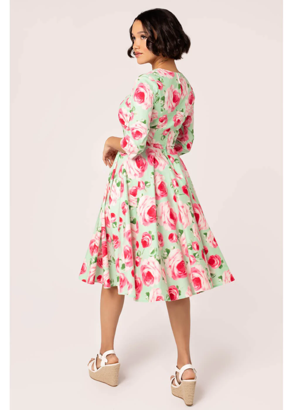 Met zo’n adembenemende swingjurk als Claire wordt elke dag gelijk een mooie dag! Die speciale dag, een gezellig uitje of gewoon naar het werk? Met haar zachte rozenprint op mintgroene katoen-mix ben jij een fleurig boeket en met zo’n elegante queen anne-halslijn en plooidetail bij de borst had je zo uit je favoriete jaren 50 film kunnen stappen. Stijl vergaat niet, net als dit boeket!