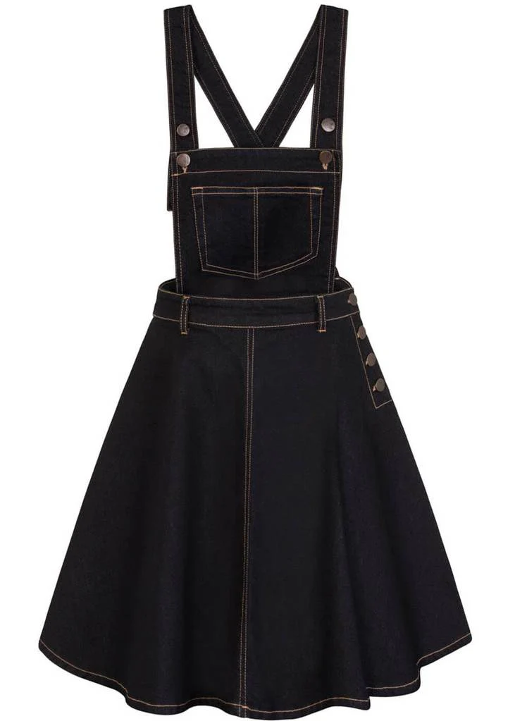 Le rabat avec la célèbre poche à l’avant donne un look inimitable et est fixé par des boutons aux bretelles ajustables. La jupe se ferme par des boutons sur le côté de la taille, puis s’évase dans une jupe légère qui arrive au-dessus du genou pour une personne mesurant 1,70 m.