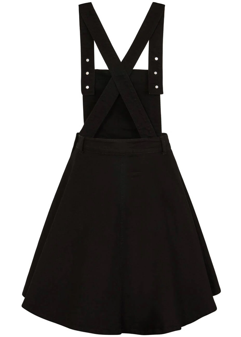 Le rabat avec la célèbre poche à l’avant offre un look indiscutable et est attaché avec des boutons aux bretelles réglables. La jupe se ferme avec des boutons sur le côté de la taille, avant de se déployer en une jupe fluide qui arrive au-dessus du genou à une hauteur de 1,70 m.