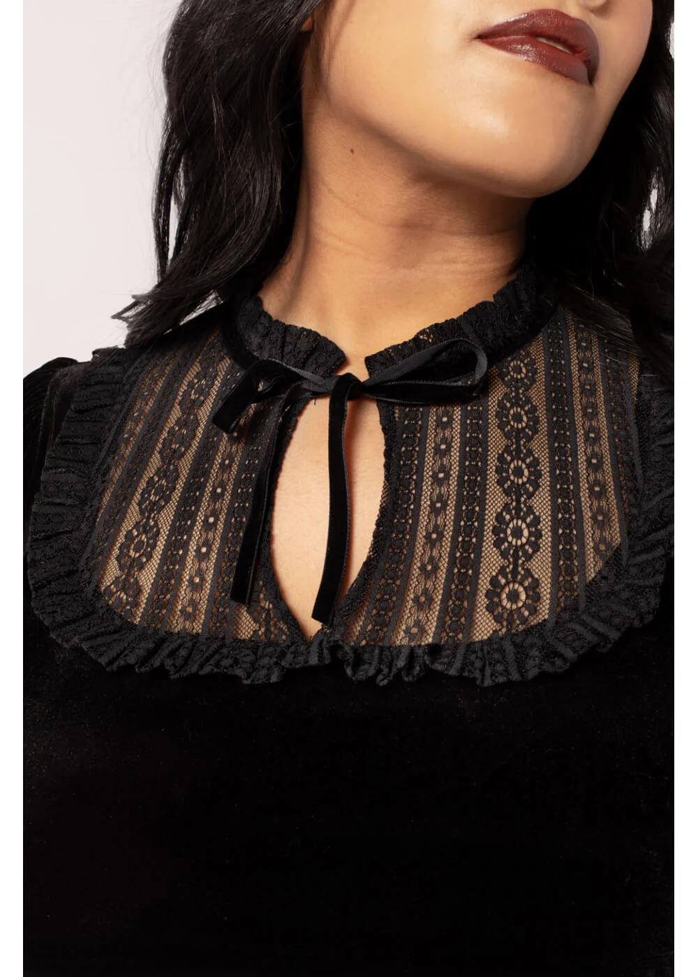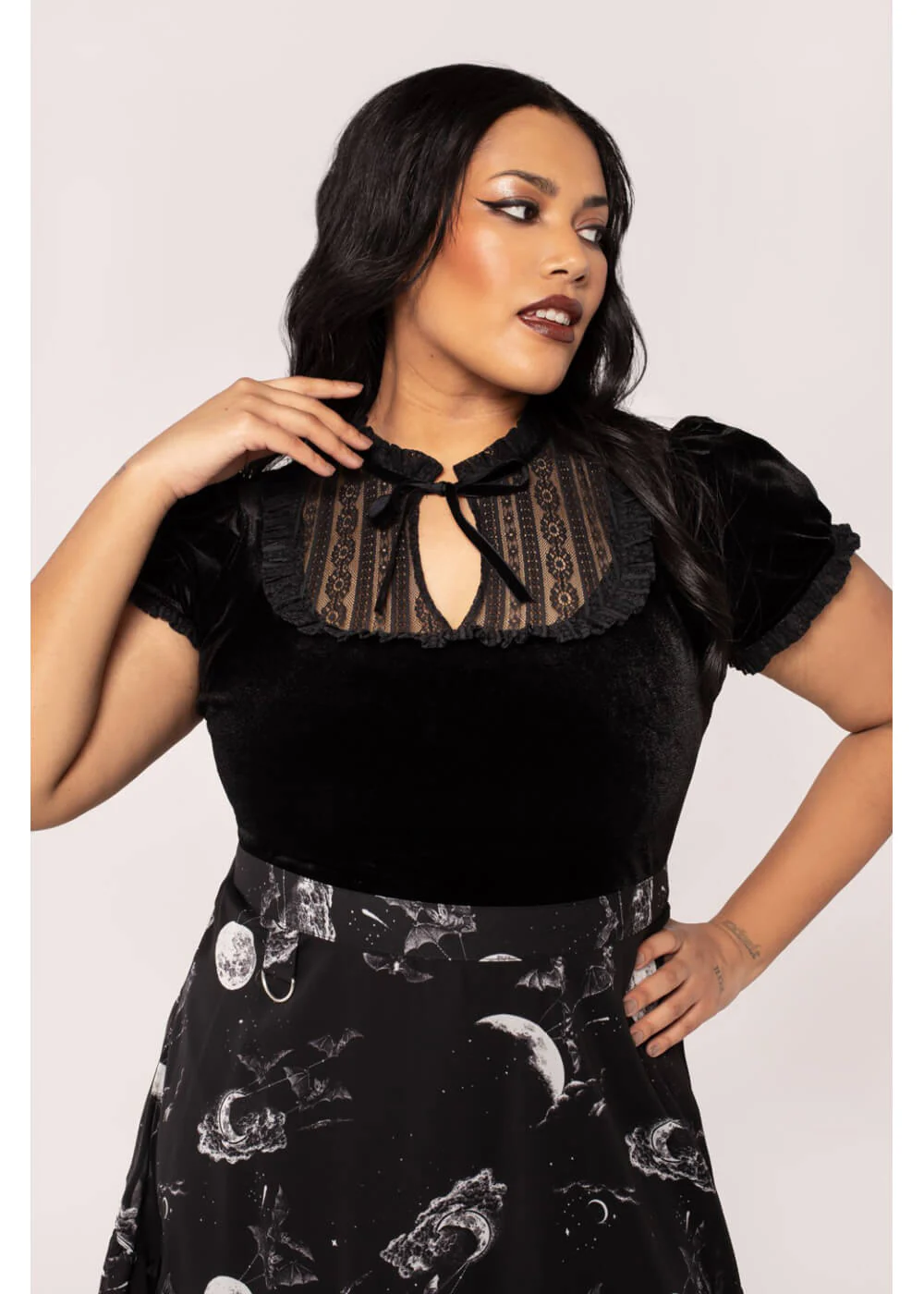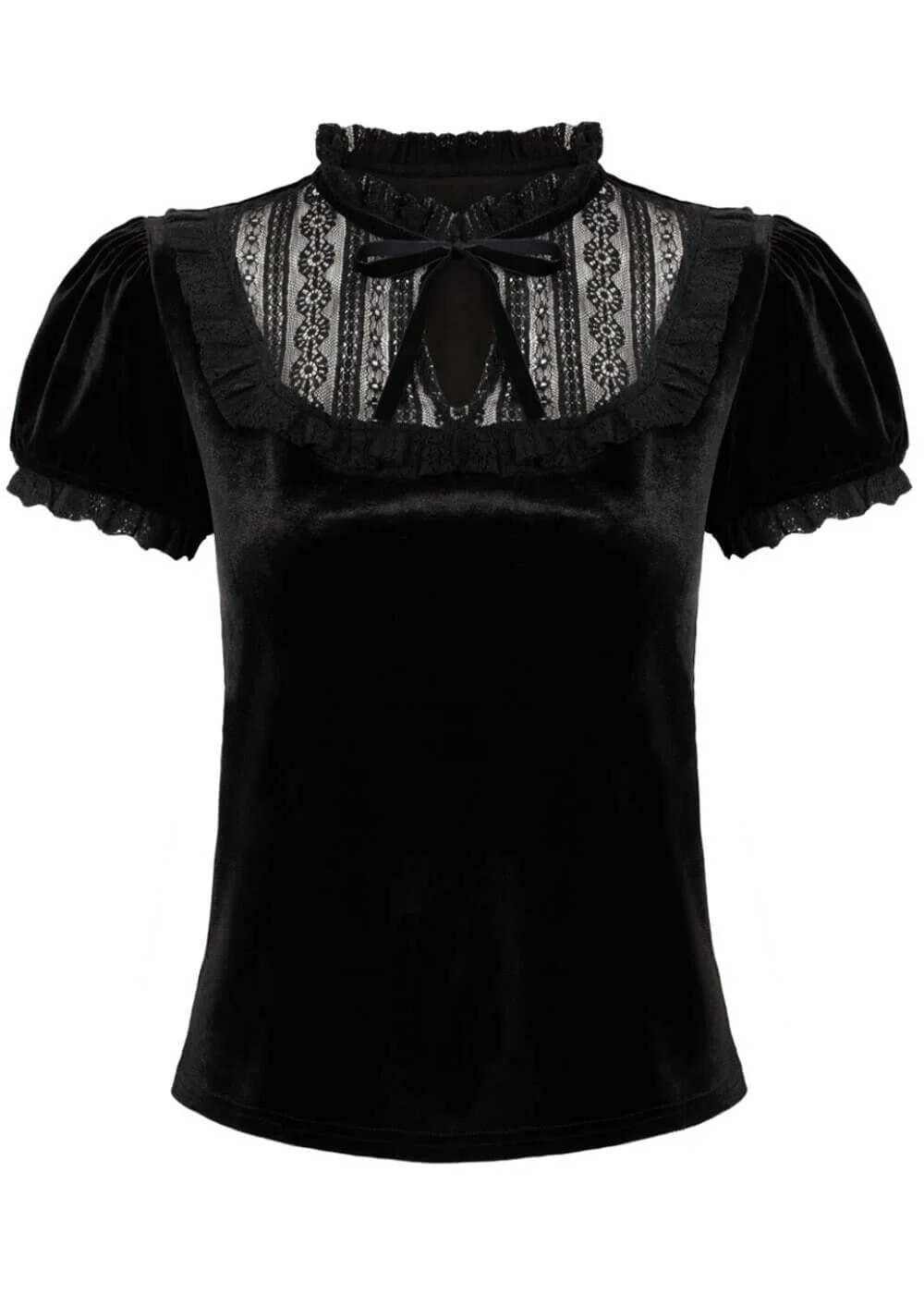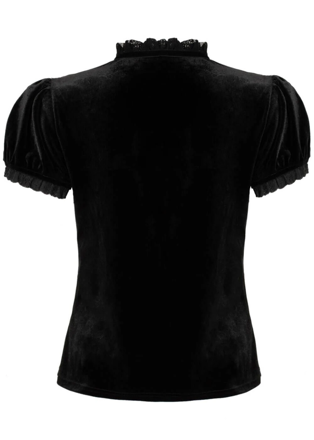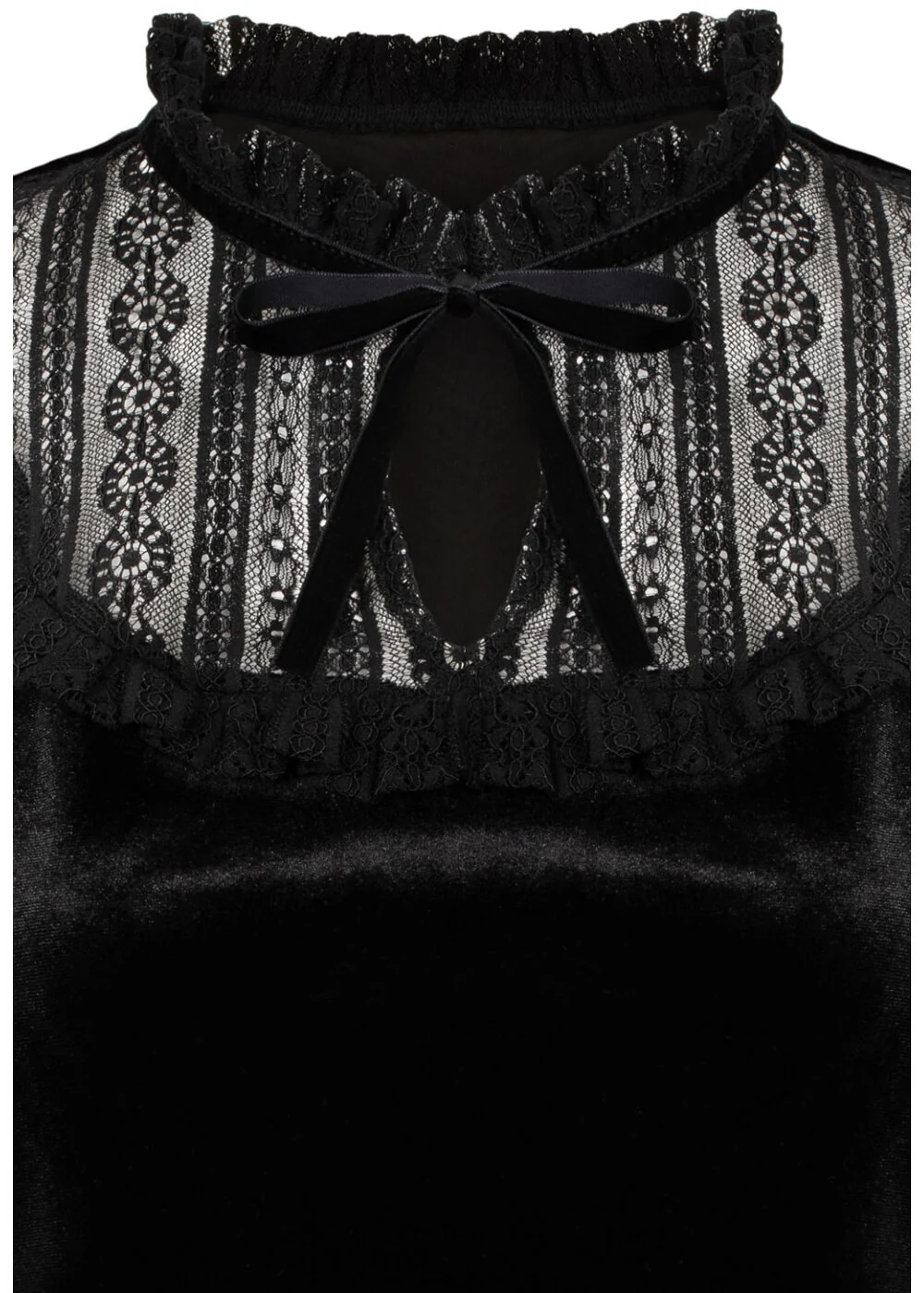 Mourning Velvet a tout ce dont vous avez besoin pour une occasion plus discrète et modeste. Si celle-ci ne se présente pas, elle est bien sûr également très appropriée pour tous les jours, car elle correspond parfaitement à la couleur de votre âme. Son velours doux, son encolure en dentelle et ses innocentes manches bouffantes vous permettent de vous en sortir partout!