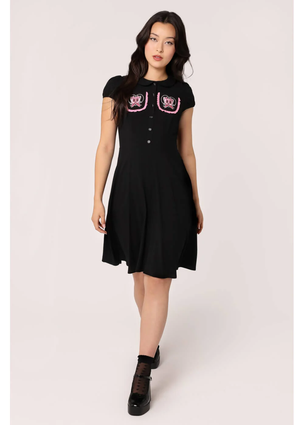 ‘Quel adorable petit chat !’ Regarde de plus près : c’est un petit démon, mais si charmant avec ses cornes roses… La robe elle-même est délicieusement douce et élégante, avec son col Peter Pan, ses manches bouffantes courtes et sa coupe raffinée. Trompeusement innocente, te diriges-tu vers l’ange ou le petit diable sur l’épaule ?