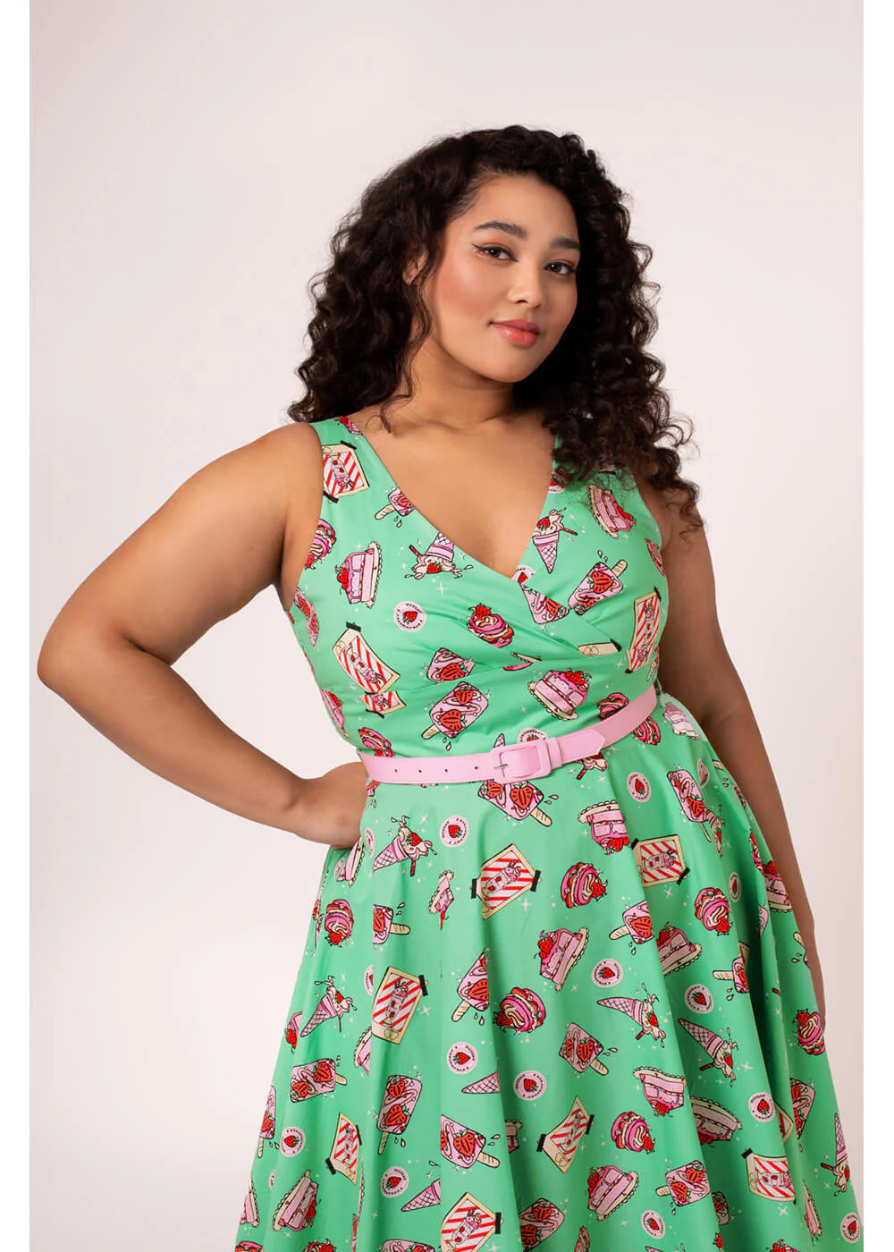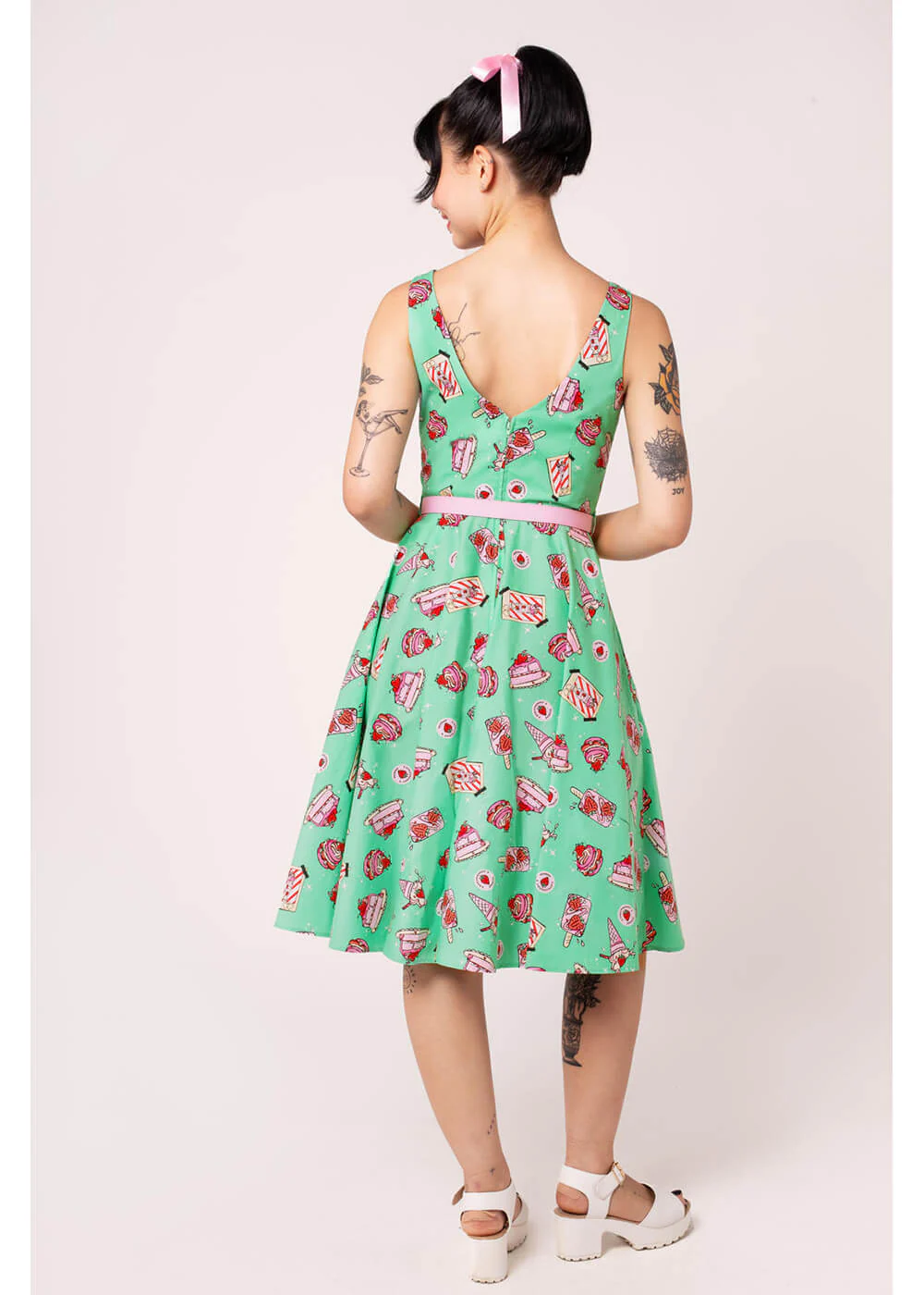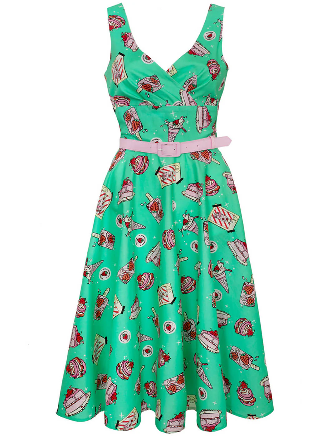 Sur un fond vert-bleu frais, glaces, parts de gâteau, cupcakes et fraises s’épanouissent joyeusement, parsemés de petites étincelles comme si vous veniez de sortir d’un diner américain. La coupe rétro présente un joli décolleté en V avec larges bretelles et une jupe ample qui tourbillonne dès le premier pas. La ceinture rose pâle apporte la touche finale — envie de quelque chose de sucré ?