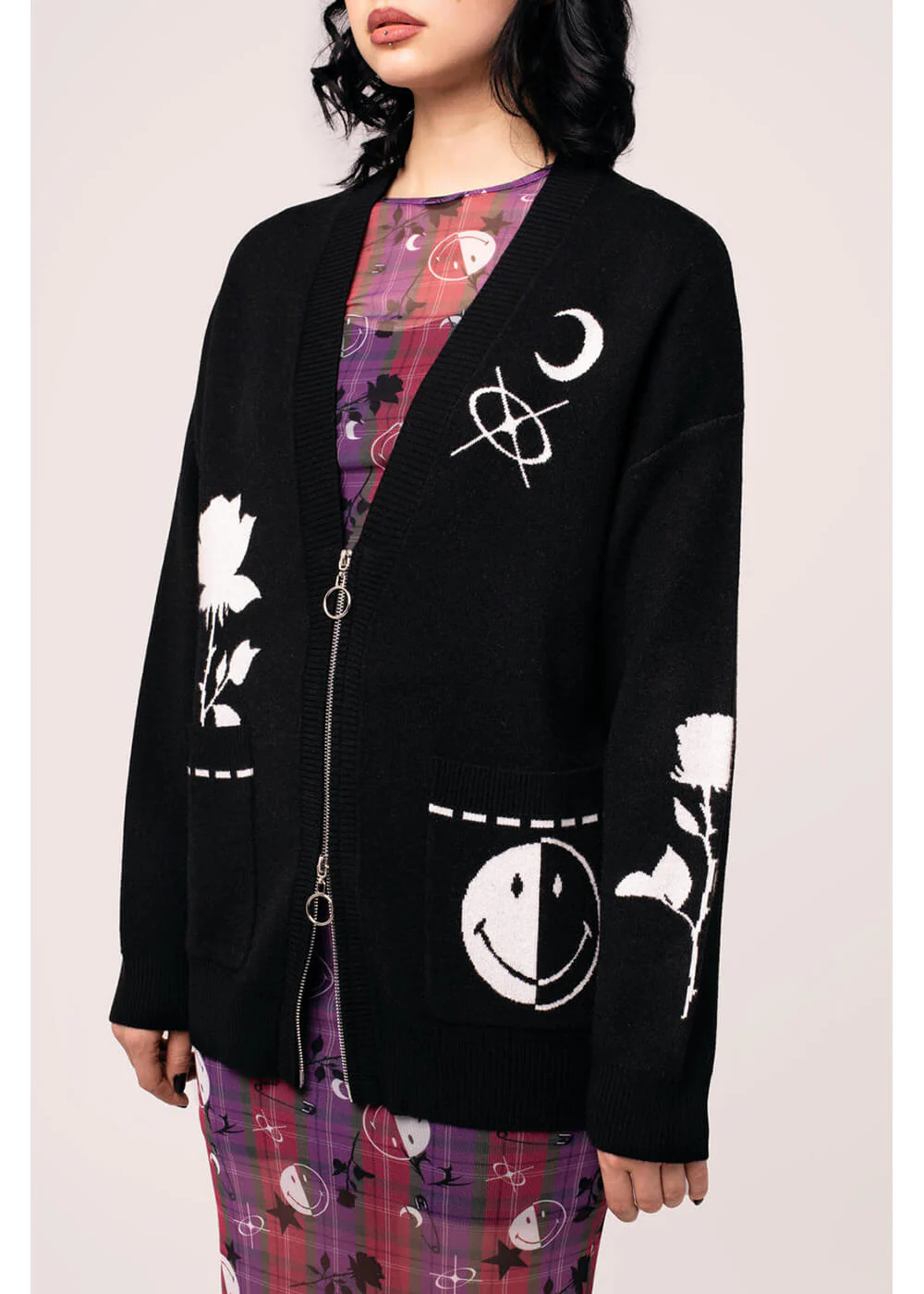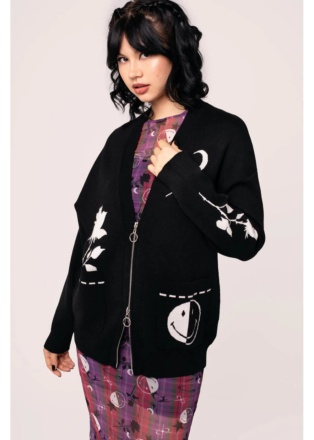 Hell Bunny et Smiley représentent l’équilibre parfait entre joie et obscurité ! Bien sûr, un bon niveau de confort est indispensable, tu pourras donc profiter d’un cardigan doux qui non seulement arbore ta couleur préférée, mais est également orné de détails souriants colorés. Fais rire tout le monde autour de toi !