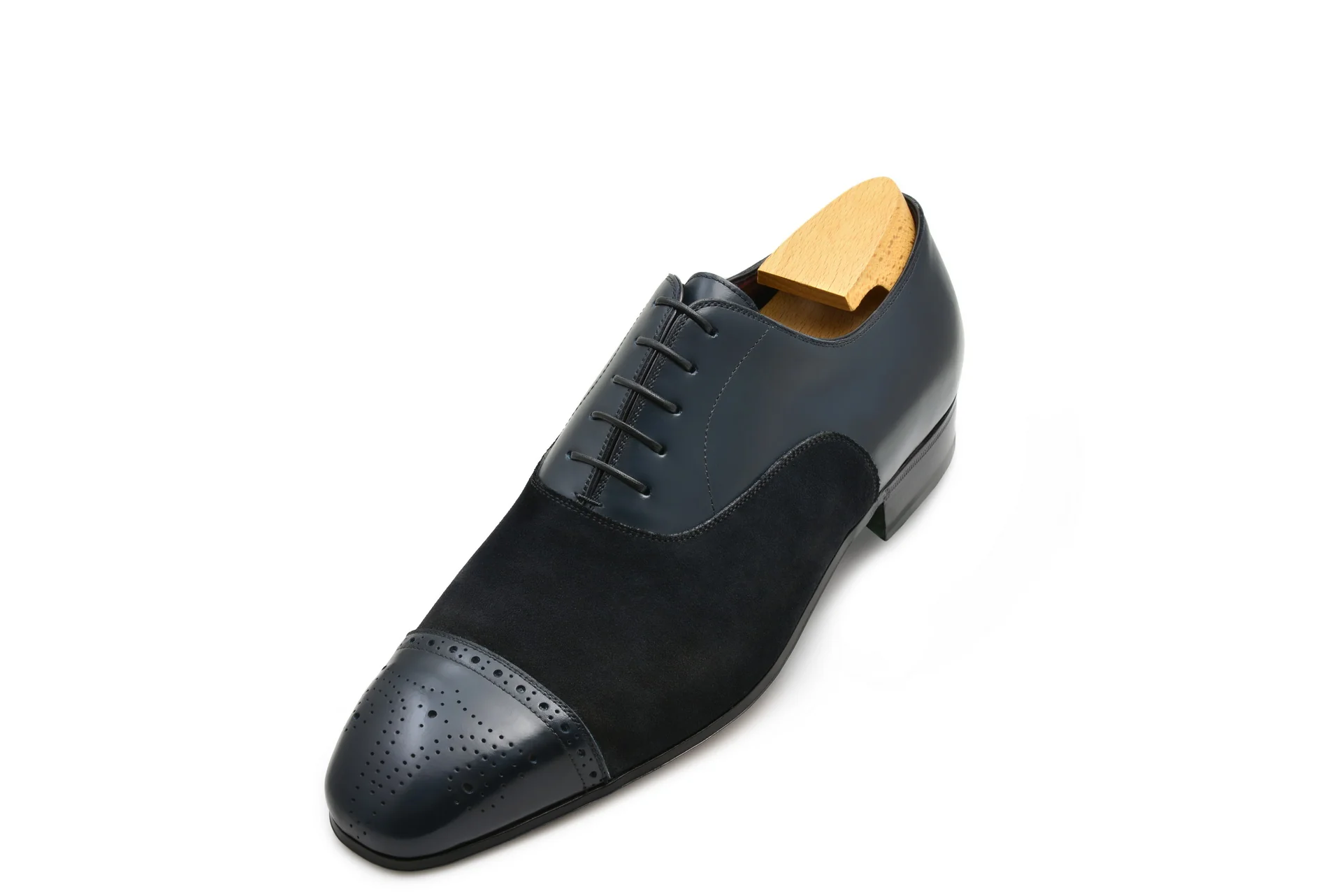 Le Jamie est une variante du célèbre James.C’est un richelieu à 5 œillets, à bout droit mais perforé, aux lignes aussi droites que dynamiques.Une proposition ici en bi-matière qui montre encore un peu plus tout ce qu’il est possible d’imaginer en terme de composition dans notre atelier.