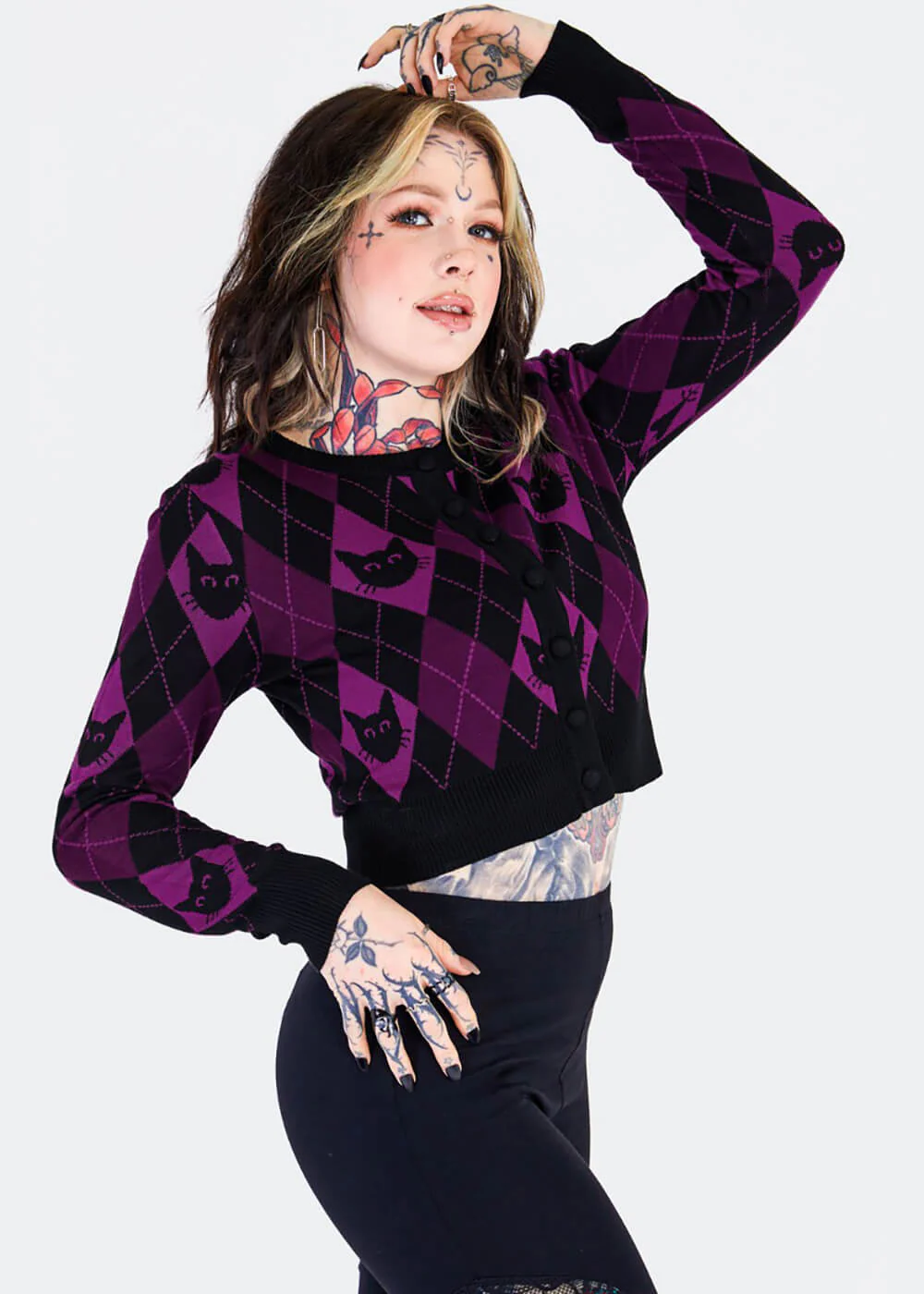 Confortable mais élégant ? Douillet mais versatile ? Une couleur et un design au top ? C’est un grand oui ! Ce modèle à motif argyle orné de petites têtes de chat noir sur un fond violet mystérieux sera votre compagnon idéal cet automne, vous assurant un look époustouflant à toute heure. Miaou !