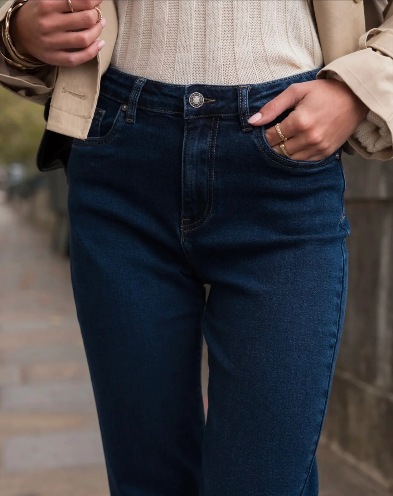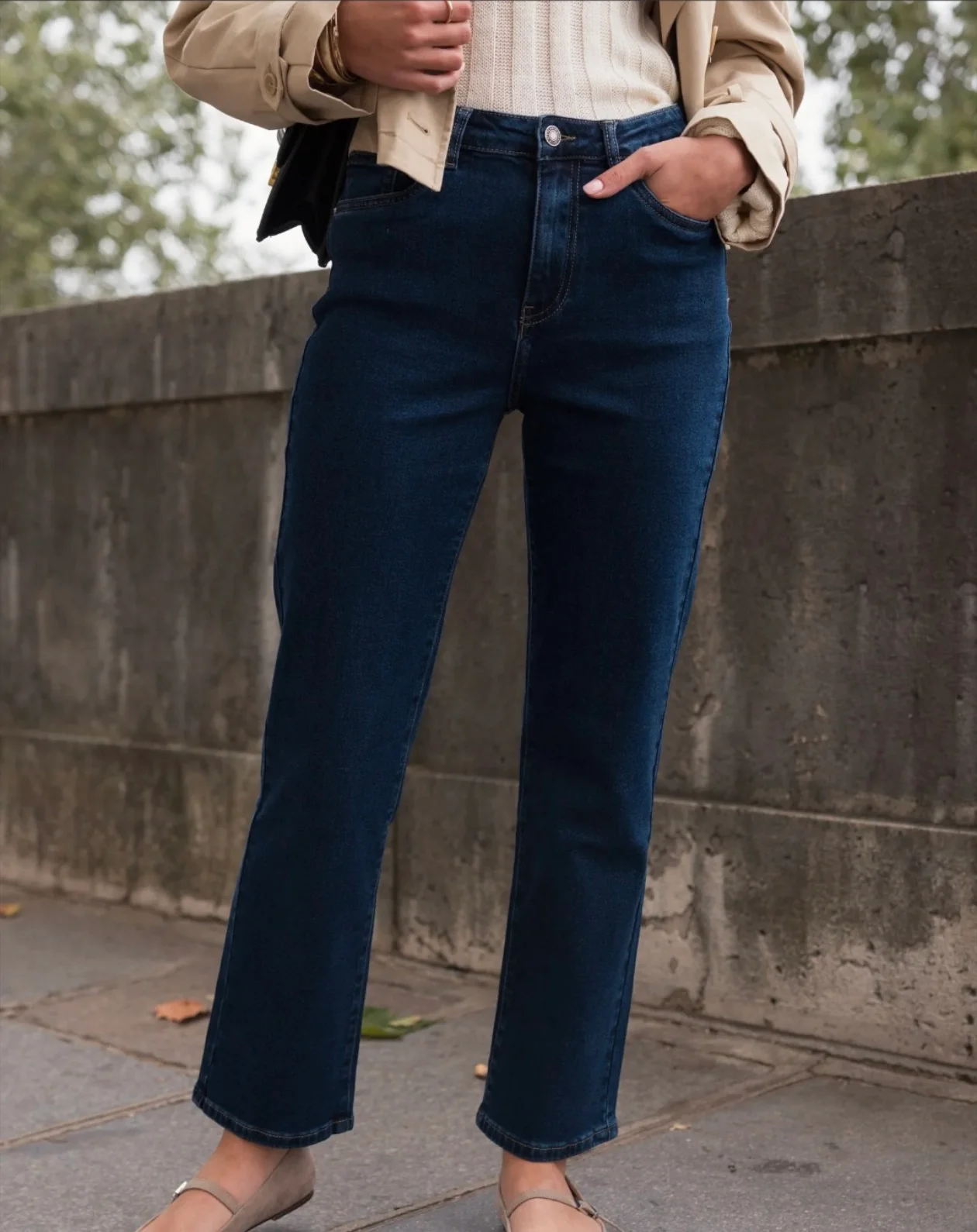 Jean droit intemporel au style élégant, idéal pour composer une tenue quotidienne raffinée. Son denim bleu profond, sublimé par des surpiqûres contrastantes, offre un look épuré facile à porter en toutes occasions.