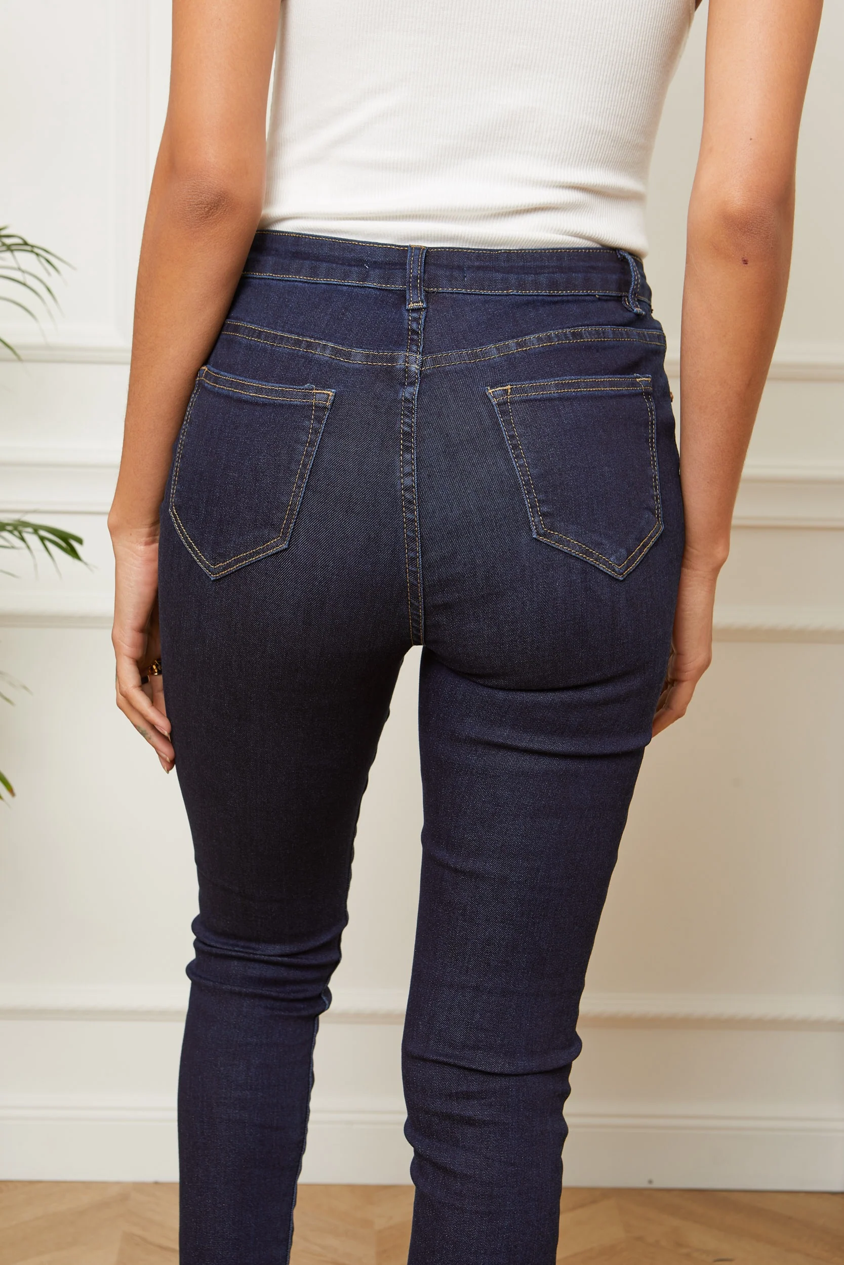 Jean slim taille haute au style intemporel, pensé pour allier confort et féminité. Sa coupe près du corps affine la silhouette sans la contraindre, grâce à une toile stretch douce et gainante.