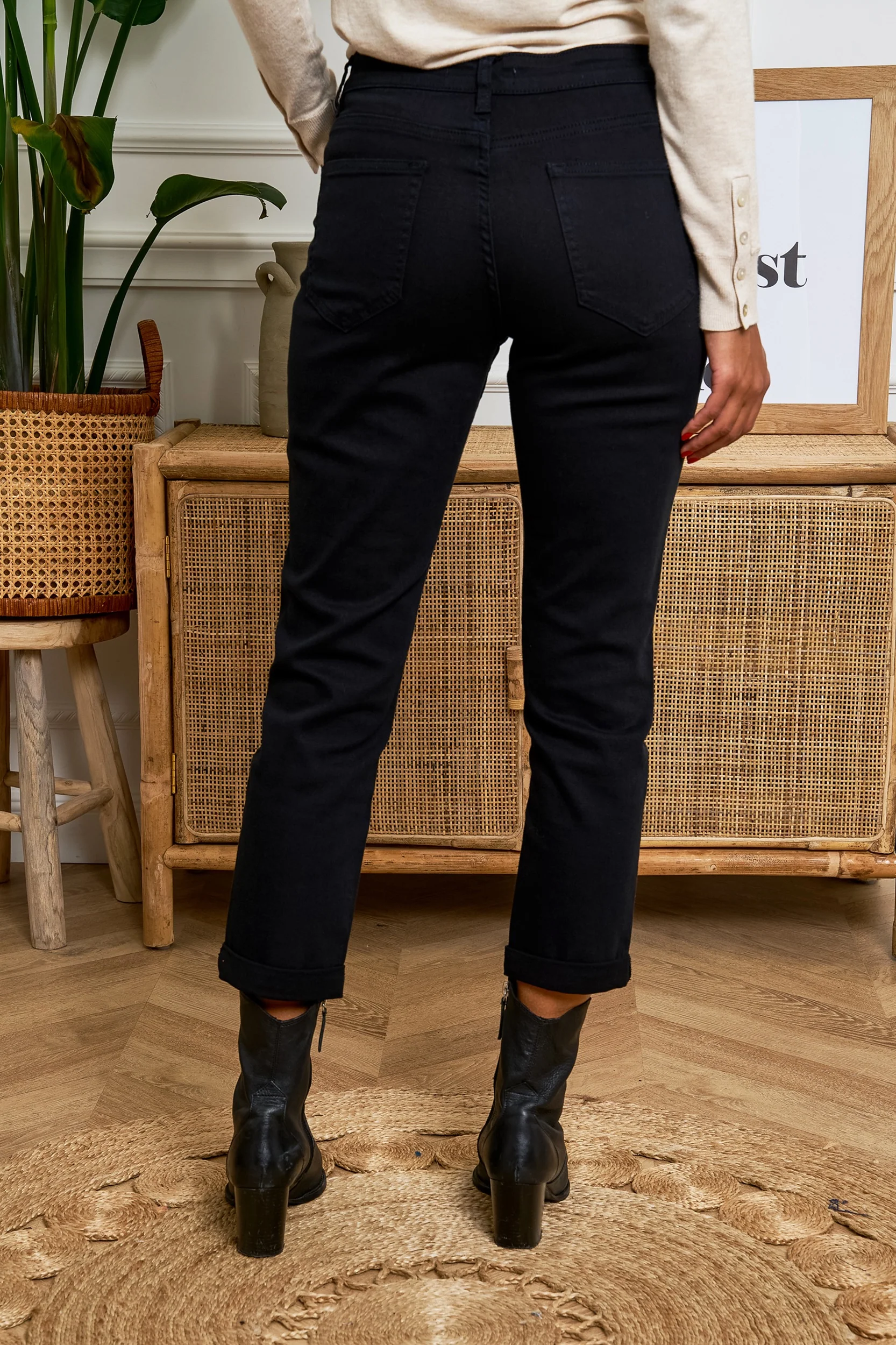 Jean relax noir à la coupe droite légèrement fuselée, conçu pour un look à la fois casual et sophistiqué. Son coloris profond et sa structure simple en font un essentiel du vestiaire féminin.