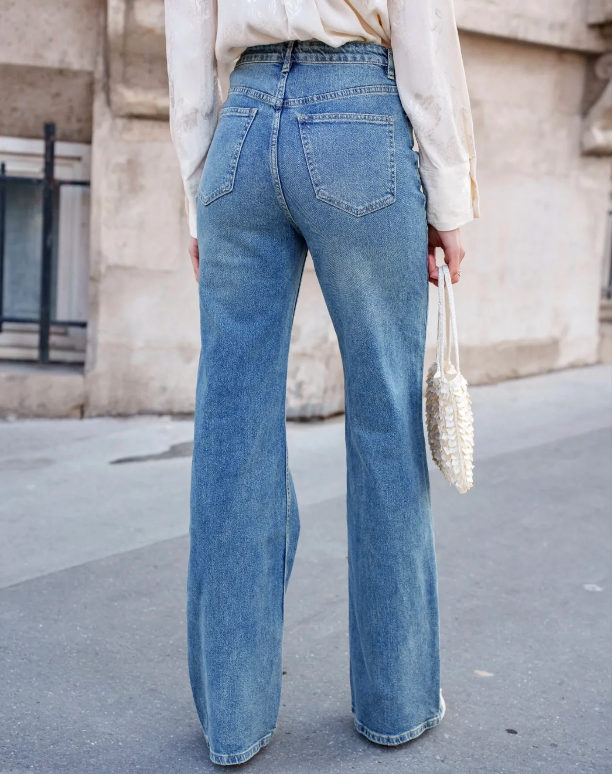 Jean wide leg en denim bleu clair, parfait pour un look rétro et féminin. Sa taille haute et sa coupe fluide allongent la silhouette tout en apportant une touche chic et décontractée.
