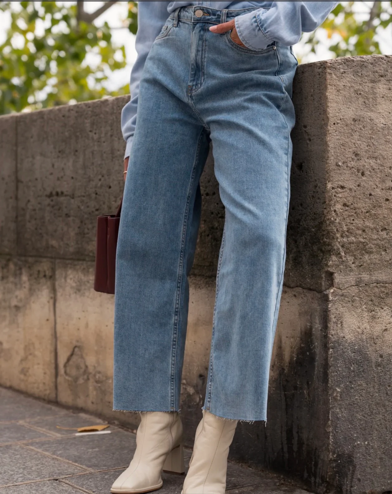 Ourlet : Longueur cheville, finition brute pour une touche tendance et casual