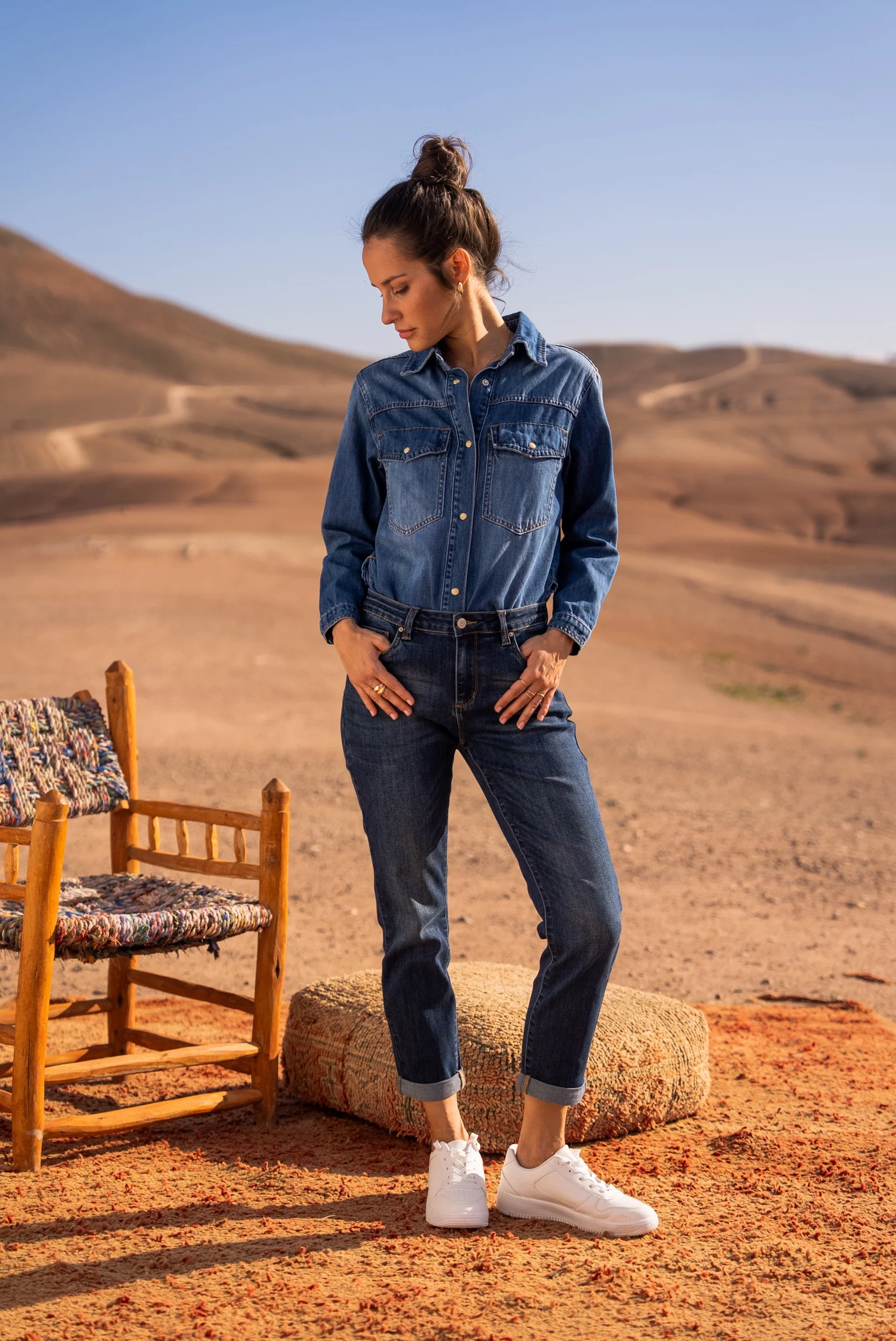 Ourlet : Longueur classique, finitions nettes ou légèrement effilochées selon les versi