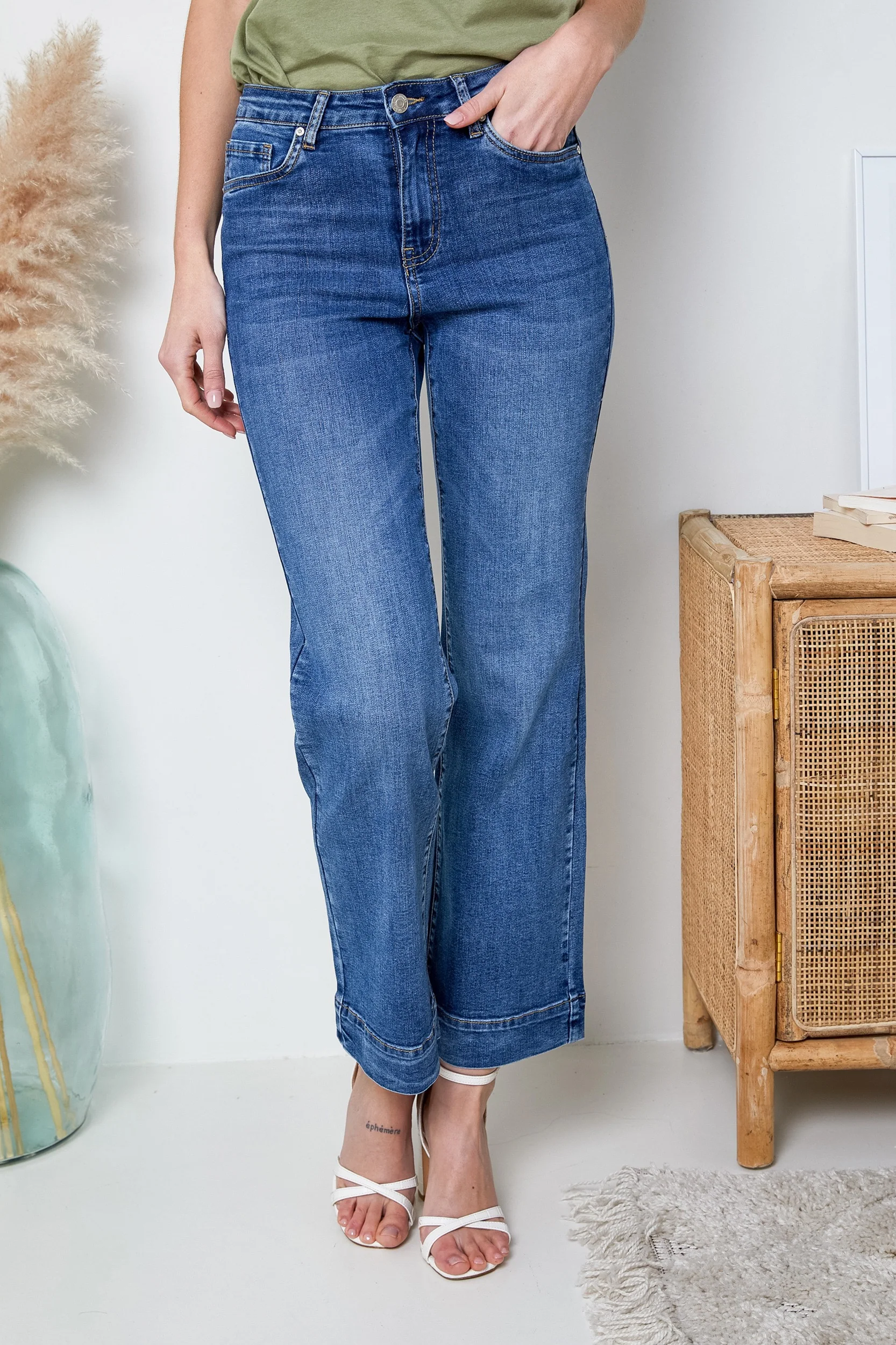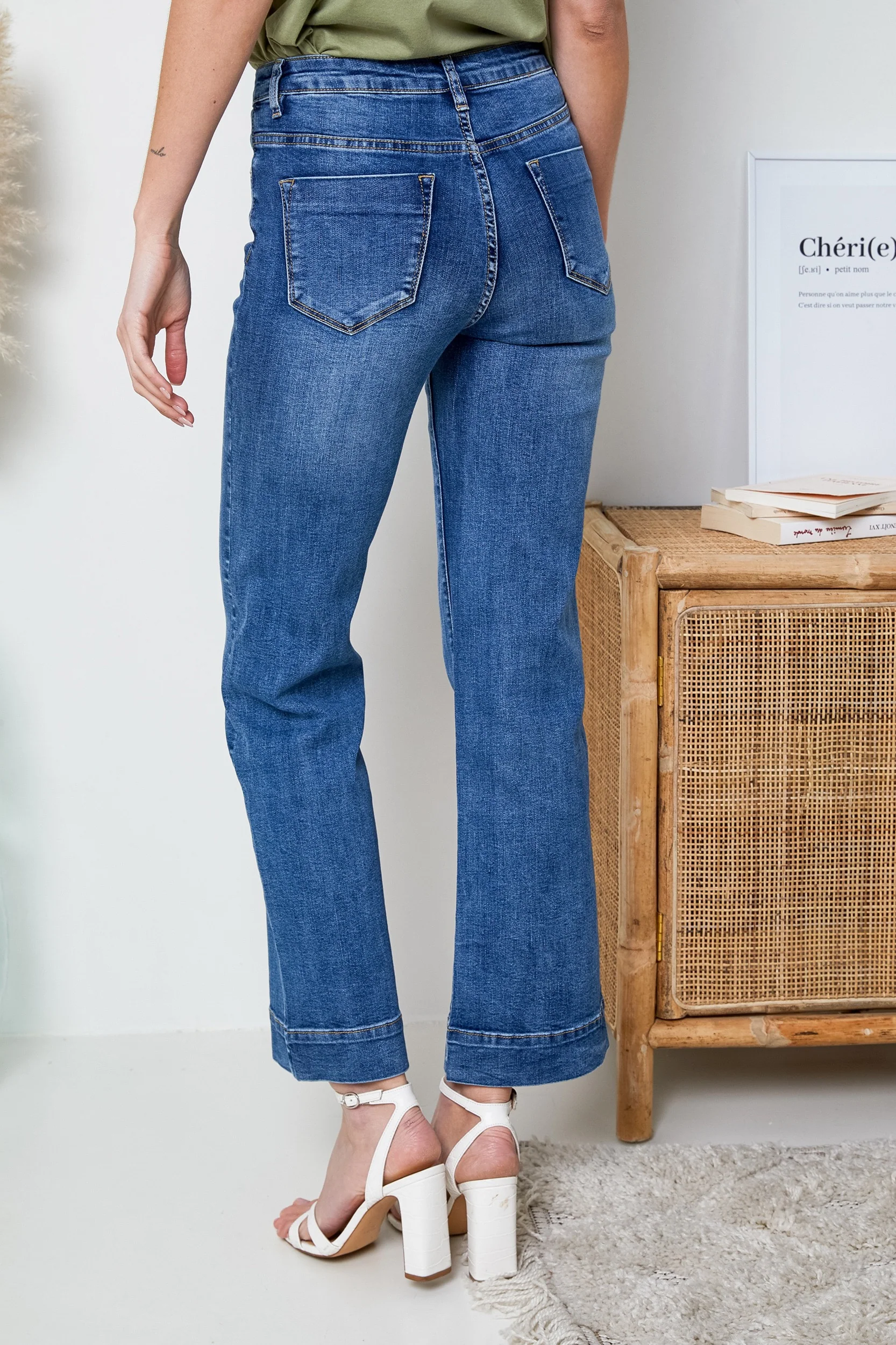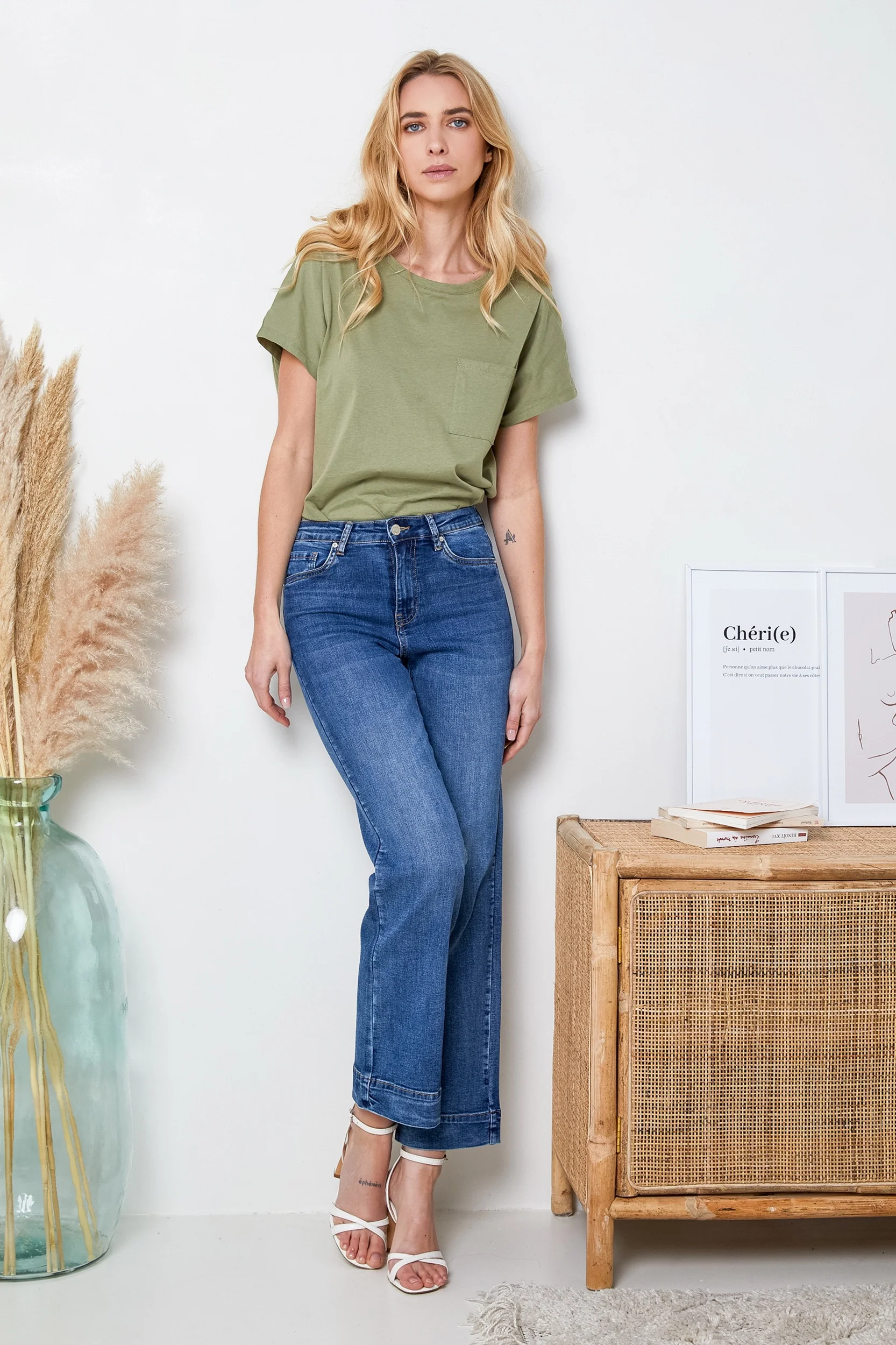 Jean flare droit, au style épuré et confortable. Sa coupe légèrement évasée à partir du genou offre un tombé naturel et une silhouette allongée. Idéal pour un look casual chic au quotidien.