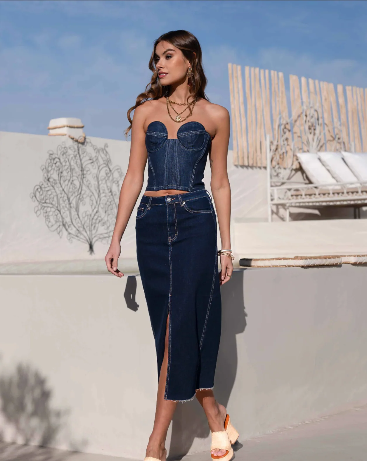 Jupe en denim brut, moderne et féminine. Sa coupe midi fendue sur le devant et son ourlet effiloché apportent une touche contemporaine à un essentiel du dressing. Parfaite pour un look city casual.