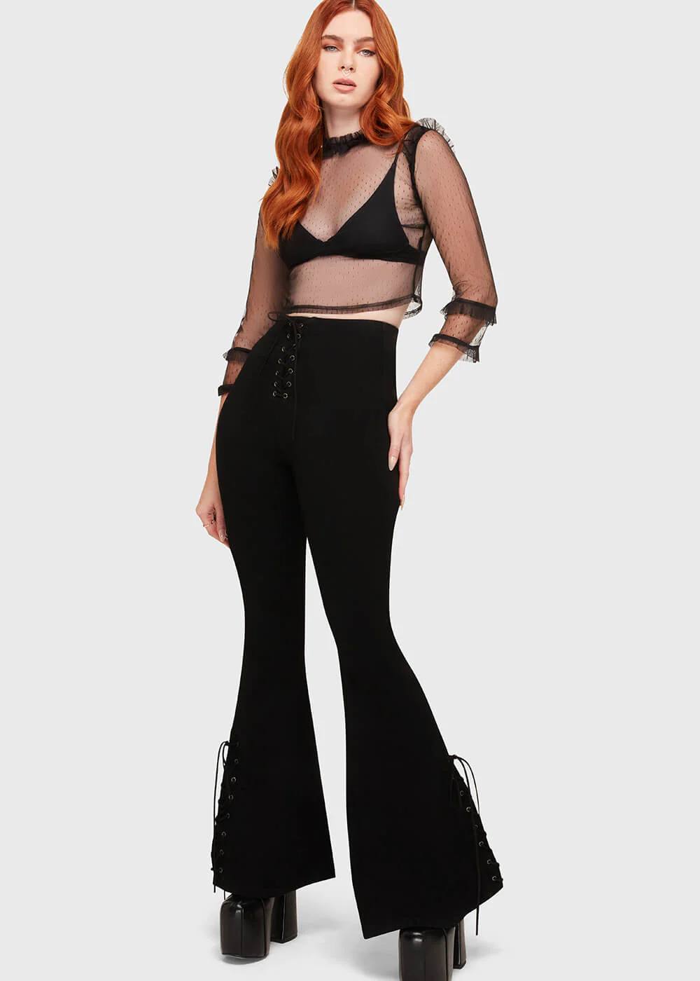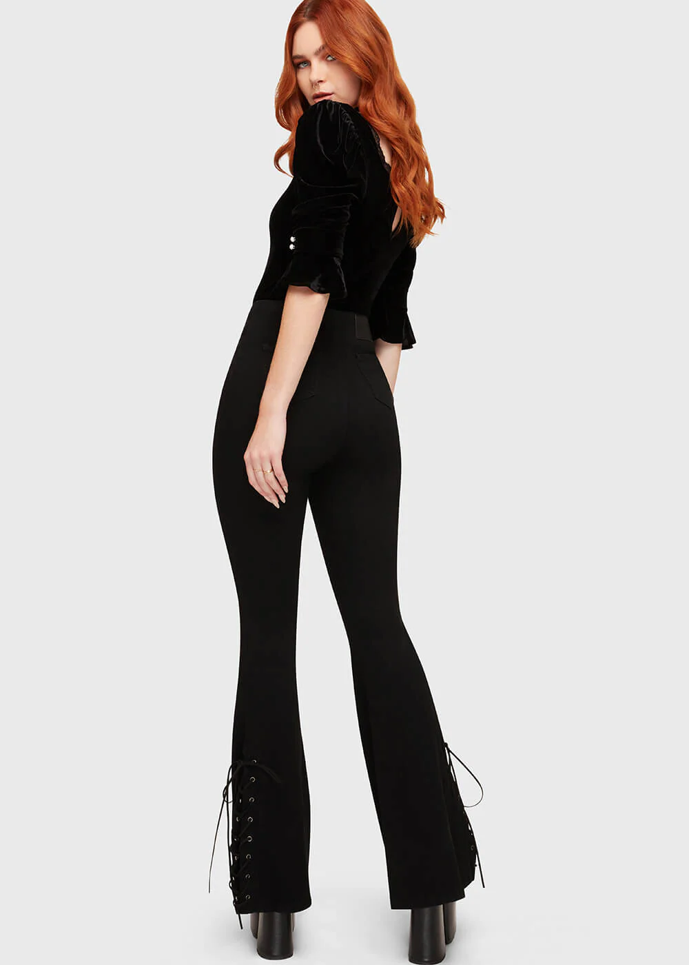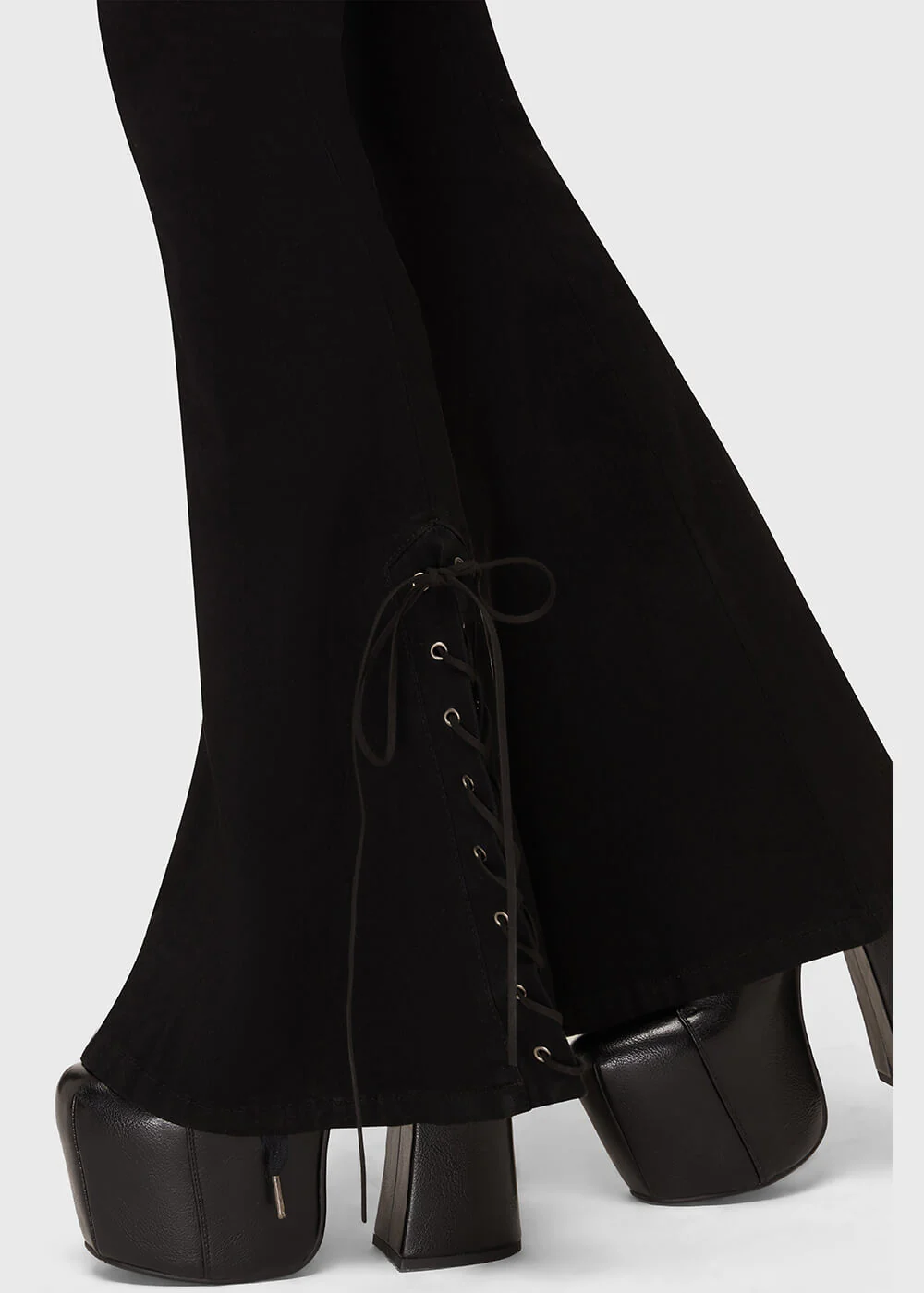 Les jambes évasées allongent immédiatement la silhouette pour un effet dramatique, parfait avec des plateformes ou des boots massives.