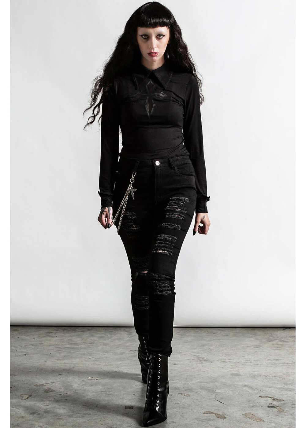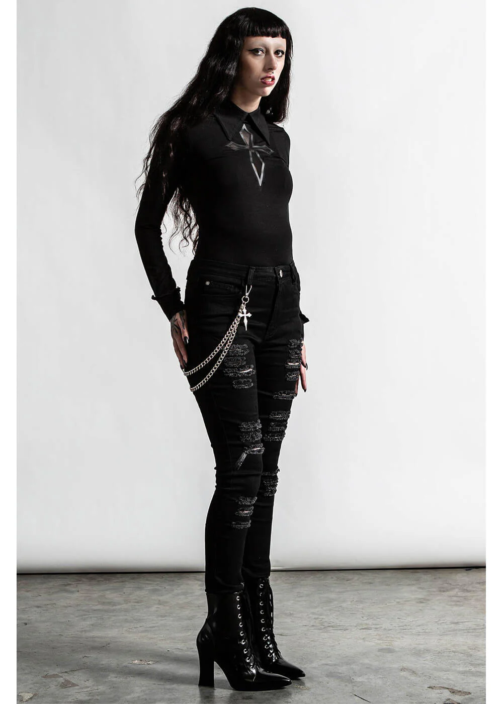 Vous avez trouvé votre nouveau jean préféré ! Son mélange de coton et de denim extensible est incroyablement doux et s’adapte parfaitement. Les détails déchirés à l’avant ajoutent un accent supplémentaire. La taille possède des passants de ceinture et elle est livrée avec une chaîne double amovible ornée d’une croix. Elle se ferme avec une fermeture éclair et un bouton, et les poches sont indispensables.