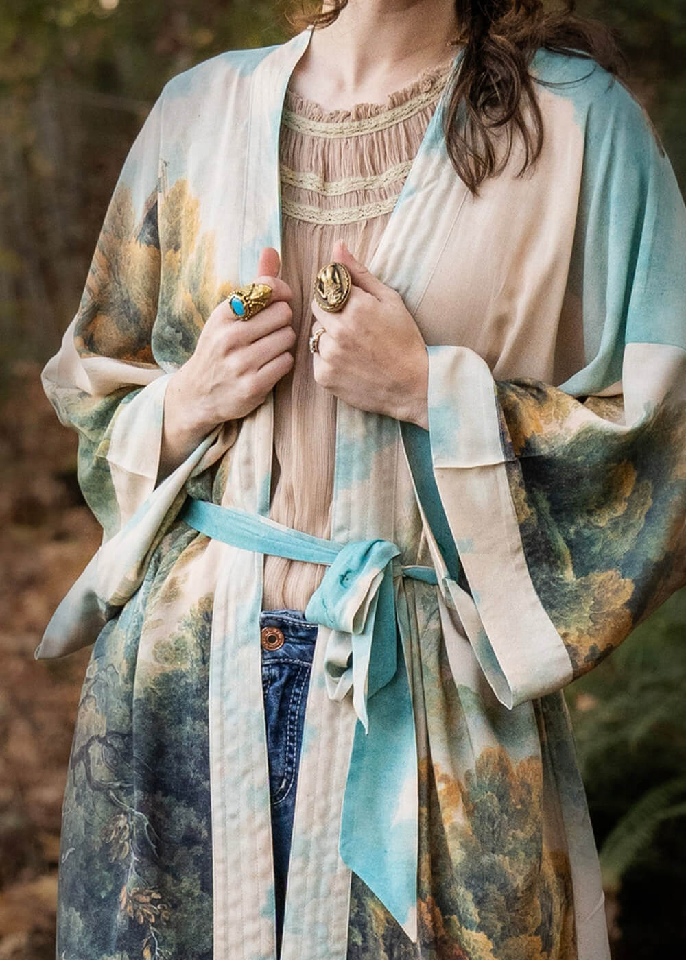 Depuis 1891, vous pouvez profiter de la lithographie unique de l’Arbre de Vie, mais maintenant sous forme de kimono ! Les « fruits » sont ceux du bonheur, comme l’amour, la joie et l’émerveillement. Une colombe, symbole de paix, se repose dans les branches de l’arbre. Une telle beauté, vous méritez de la porter, n’est-ce pas ?