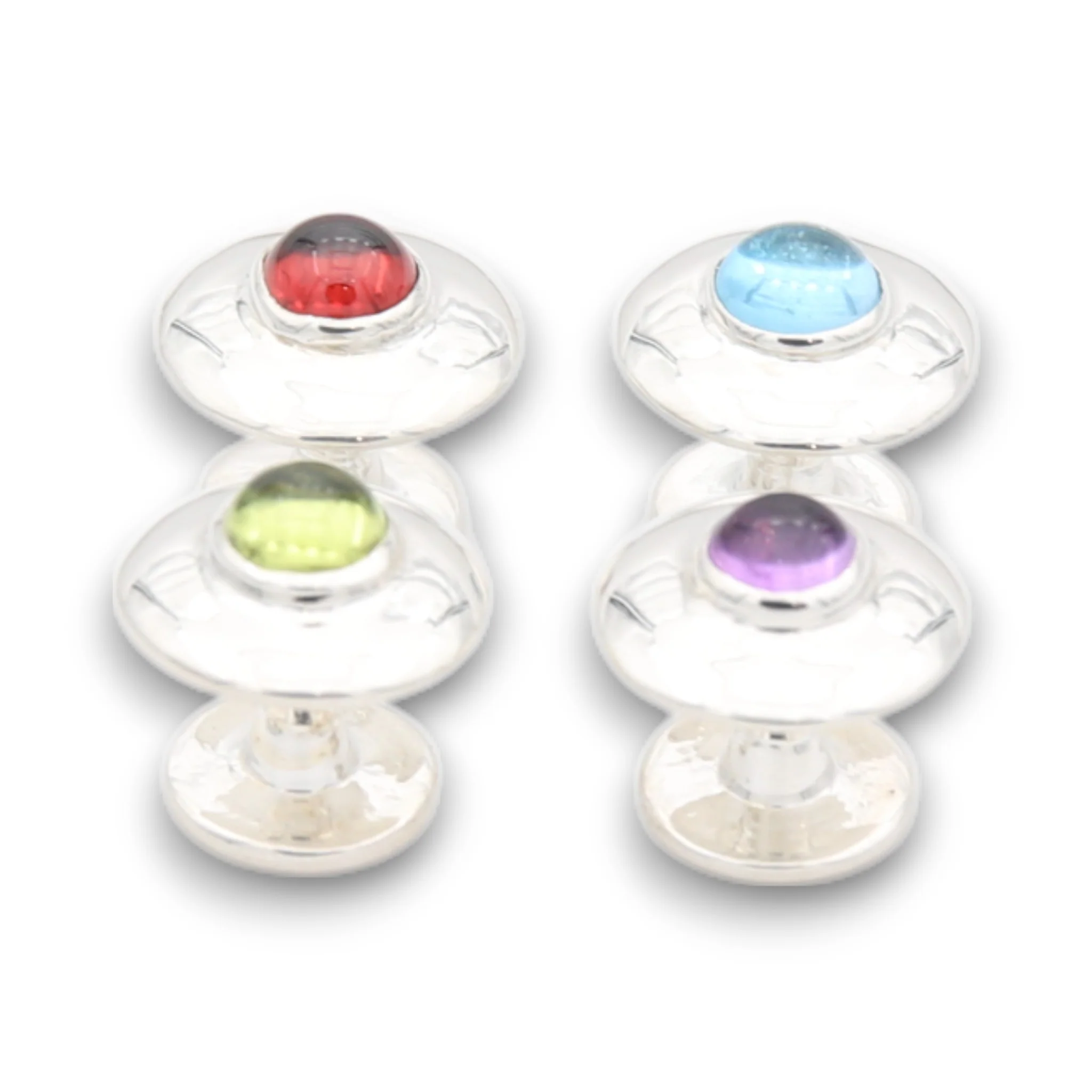 Elegantes Knopfset aus 925er Sterlingsilber mit vier kostbaren Steinen: leuchtendem Blautopas, tiefrotem Granat, violettem Amethyst und zartem Peridot. Jeder Knopf vereint Handwerkskunst mit zeitloser Eleganz und verleiht Smoking- und Frackhemden eine distinguierte Note. Das Set besticht durch seine harmonische Farbkomposition und die hochwertige Verarbeitung des Edelmetalls – ein Statement für anspruchsvolle Herrenmode.