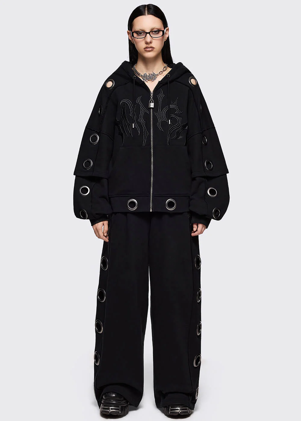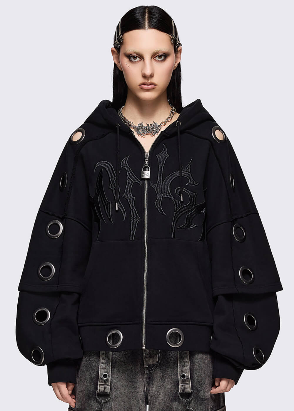 Dark Streetwear, Grunge & Y2K: Minga London reste résolument edgy!rnrnPremière impression ? Impact immédiat. On adore les manches superposées, le ‘Minga’ brodé sur le devant et le petit cadenas en guise de tirette. Les larges oeillets argentés se prolongent sur la capuche généreuse pour un rendu affirmé. Une pièce, un style tranchant.rnrn- Confectionné en coton avec légère élasticitérn- Coupe oversizern- Oeillets argentésrn- Capuche équipée d’oeilletsrn- Poches kangourourn- Manches longues superposéesrn- ‘Minga’ brodé sur le devantrn- Fermeture zippée avec petit cadenas en pendentifrn- Conseil : taille grand pour un look oversizern- Le mannequin porte une taille S/M et mesure 172 cmrn- 100% coton