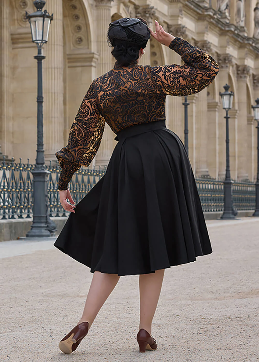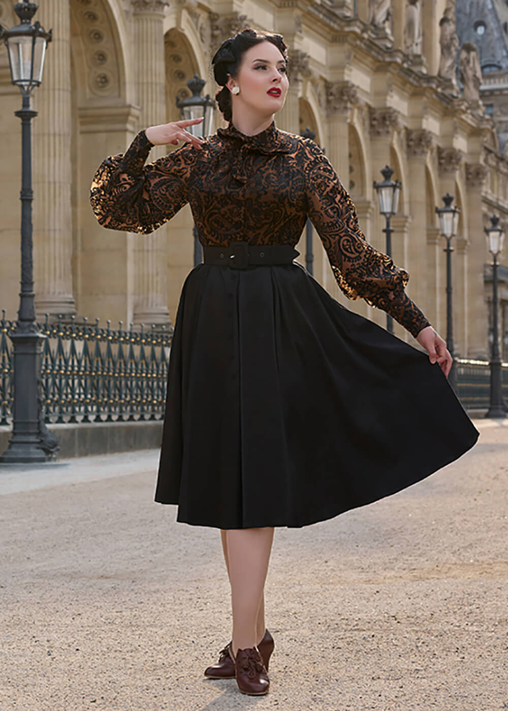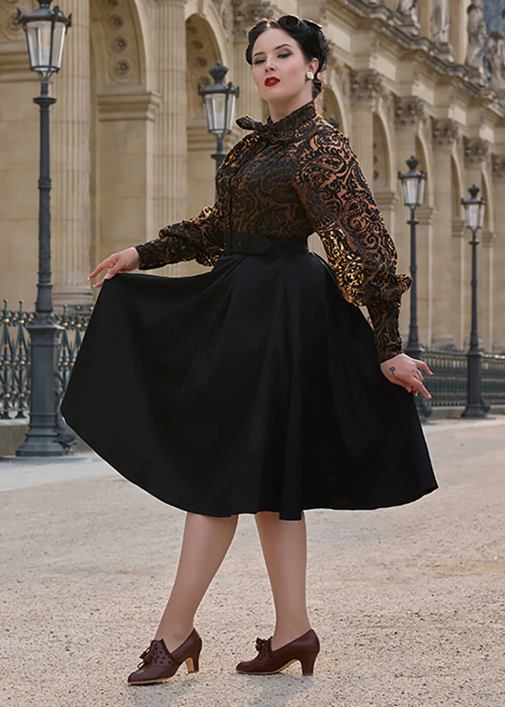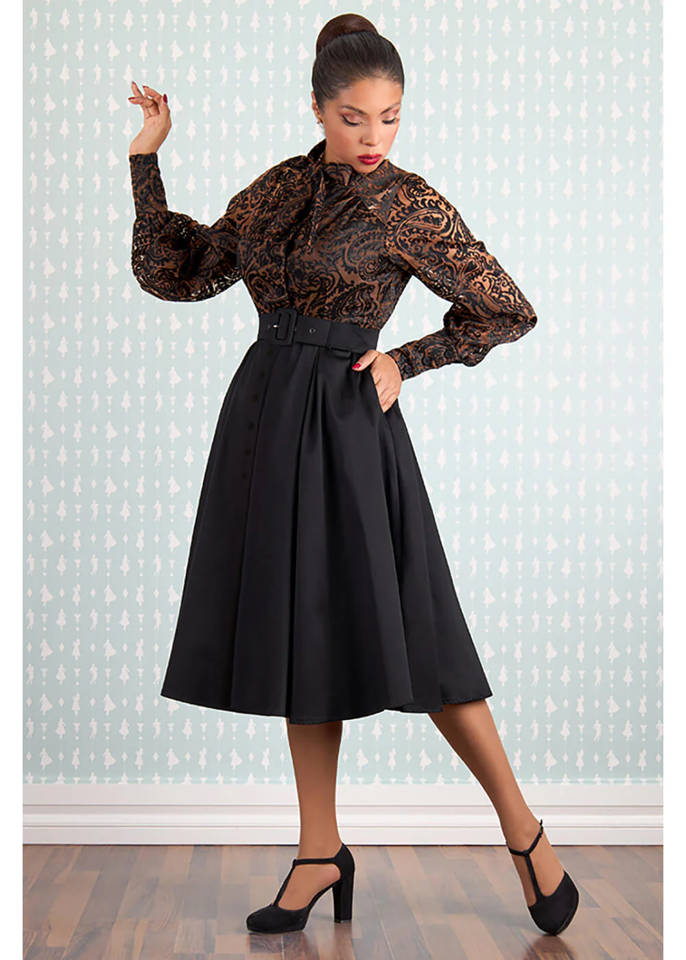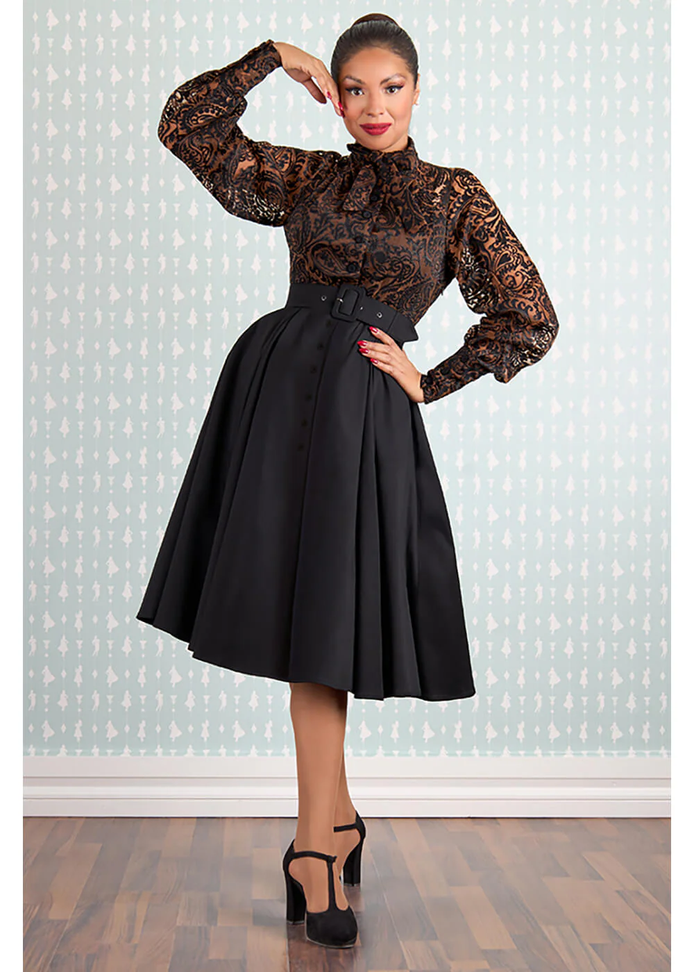Breng de elegantie van de jaren ’50 in jouw garderobe met deze adembenemende jurk, met haar semi-transparante stevige nylon met flocking fluwelen bloemen en subtiel gevoerd lijfje… Met haar geaccentueerde taille met riem en zwierig uitlopende rok van katoen ben jij extra feestelijk deze feestdagen en is dan ook perfect om in te dansen, de sjansen en in te genieten ♥